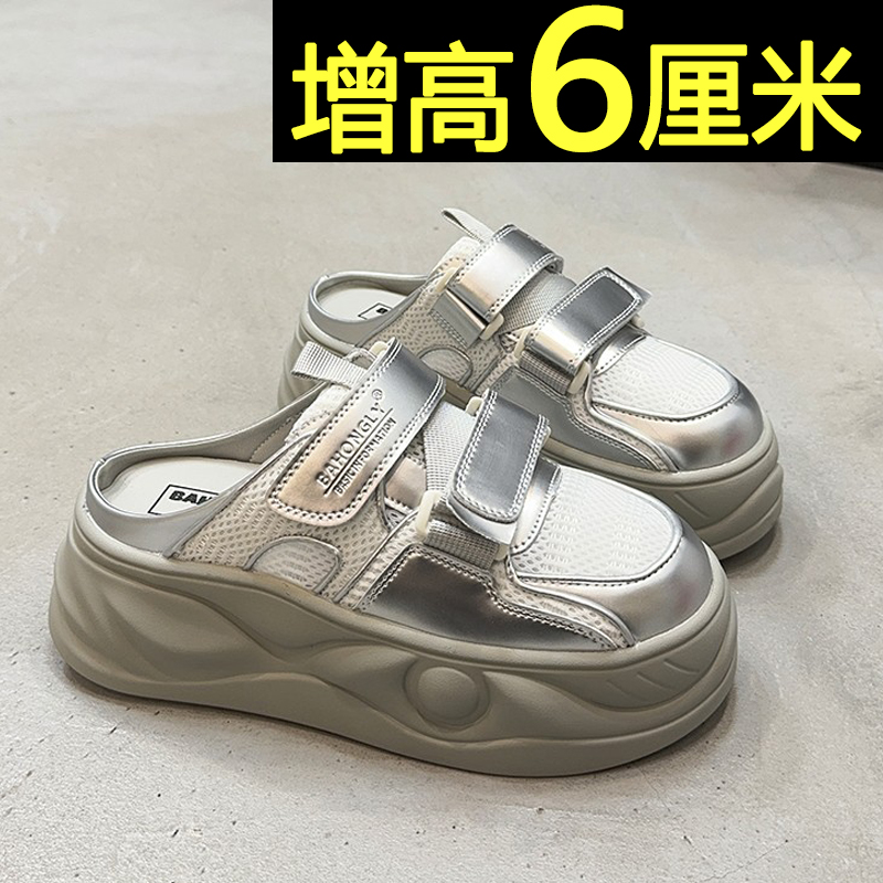 厚底包头半拖鞋女夏季外穿2025超火一脚蹬懒人鞋网面内增高小白鞋
