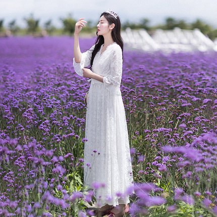 【现货】雪纺白色连衣裙女高级感夏2025新款蕾丝长裙收腰显瘦裙子