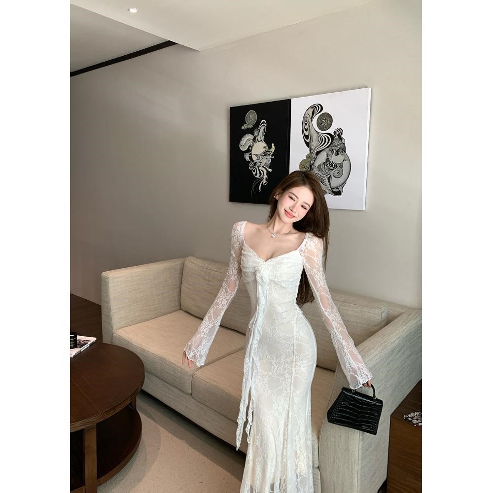 法式白色v领长袖连衣裙女秋季蕾丝拼接修身长裙气质收腰包臀裙子
