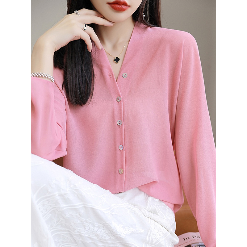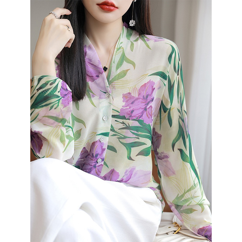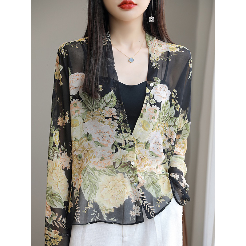 夏季乔其纱气质碎花衬衫女V领长袖薄款开衫真丝质感外搭防晒上衣