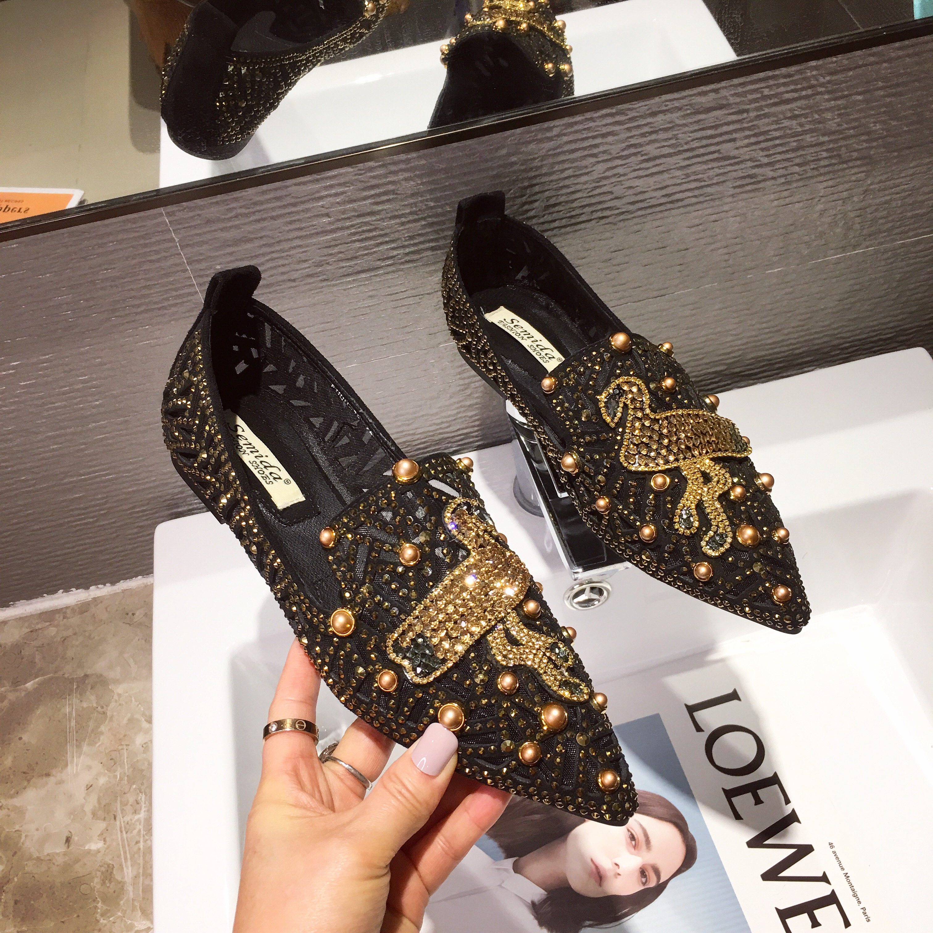 欧洲站2025春夏季新款尖头平底百搭水钻铆钉透气网沙一脚蹬单鞋女