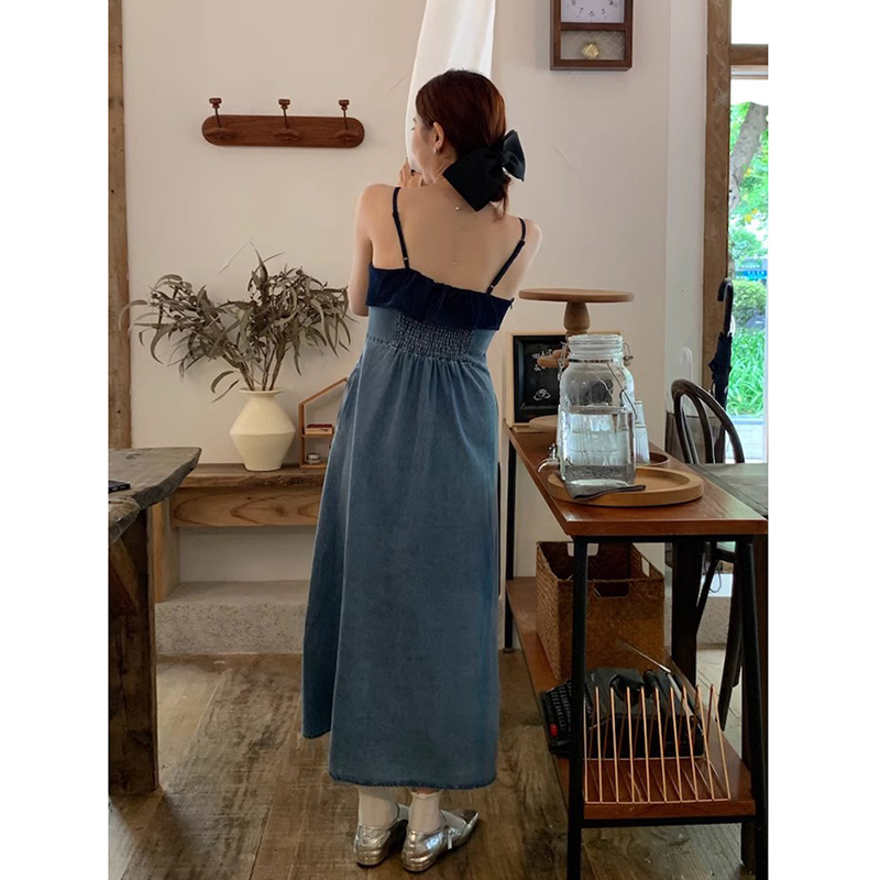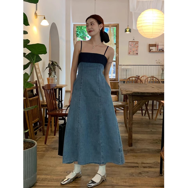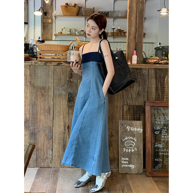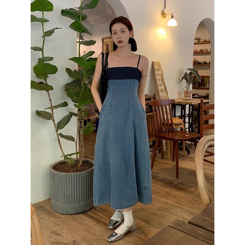 良良家撞色拼接牛仔吊带连衣裙女夏季新复古小众收腰显瘦大摆长裙