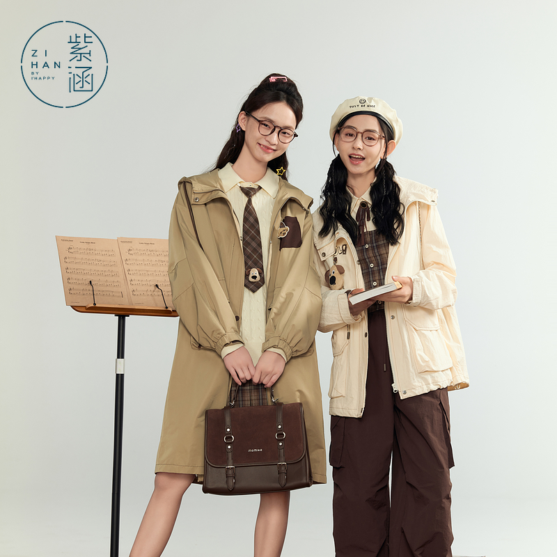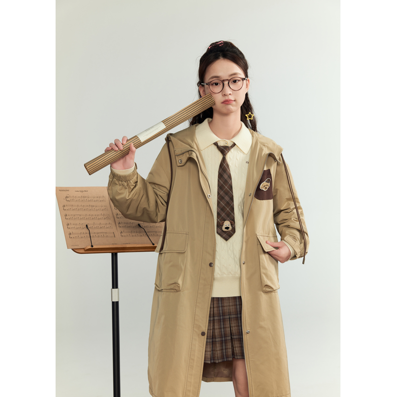 紫涵抽绳连帽中长款风衣女秋季新款日系学院风宽松通勤休闲长外套