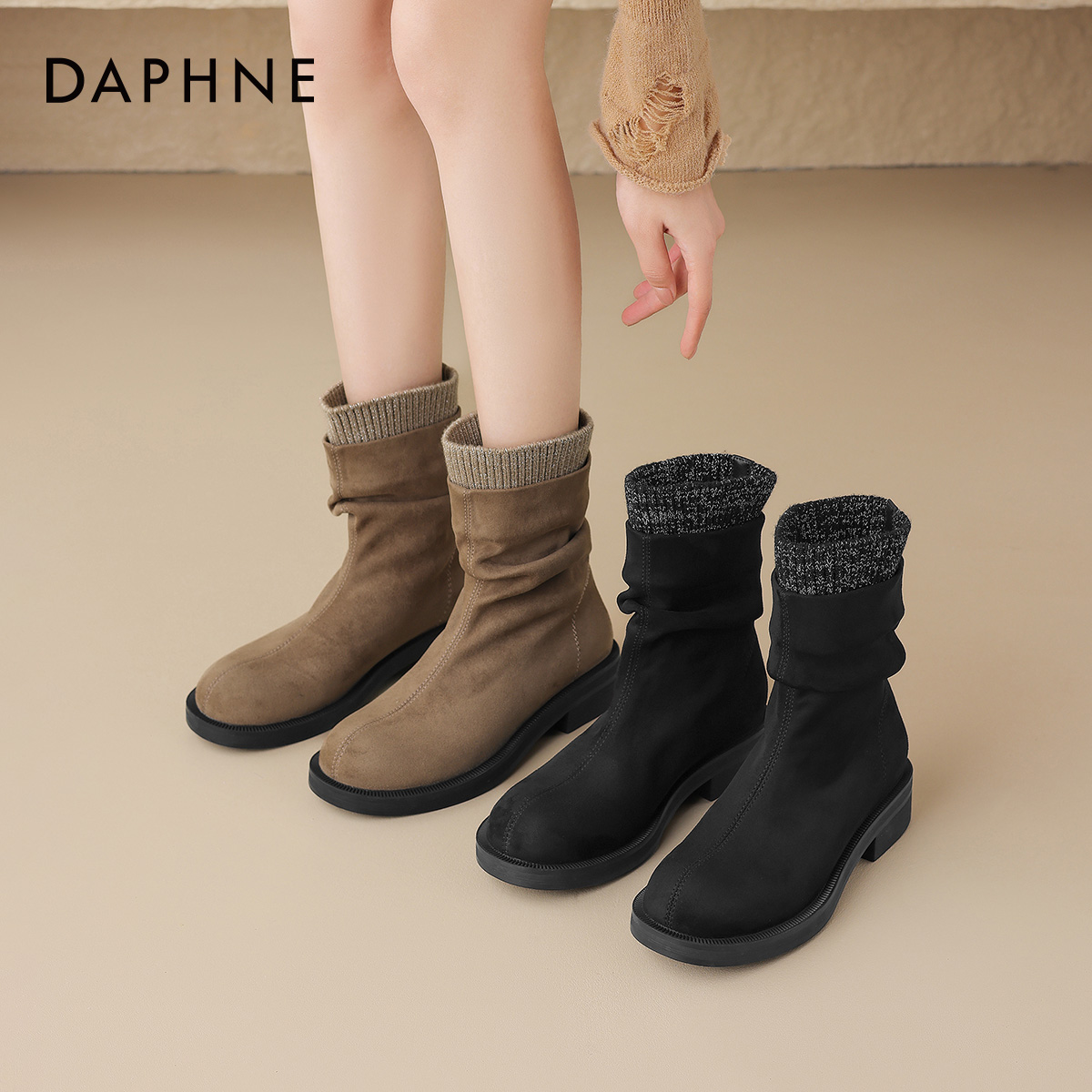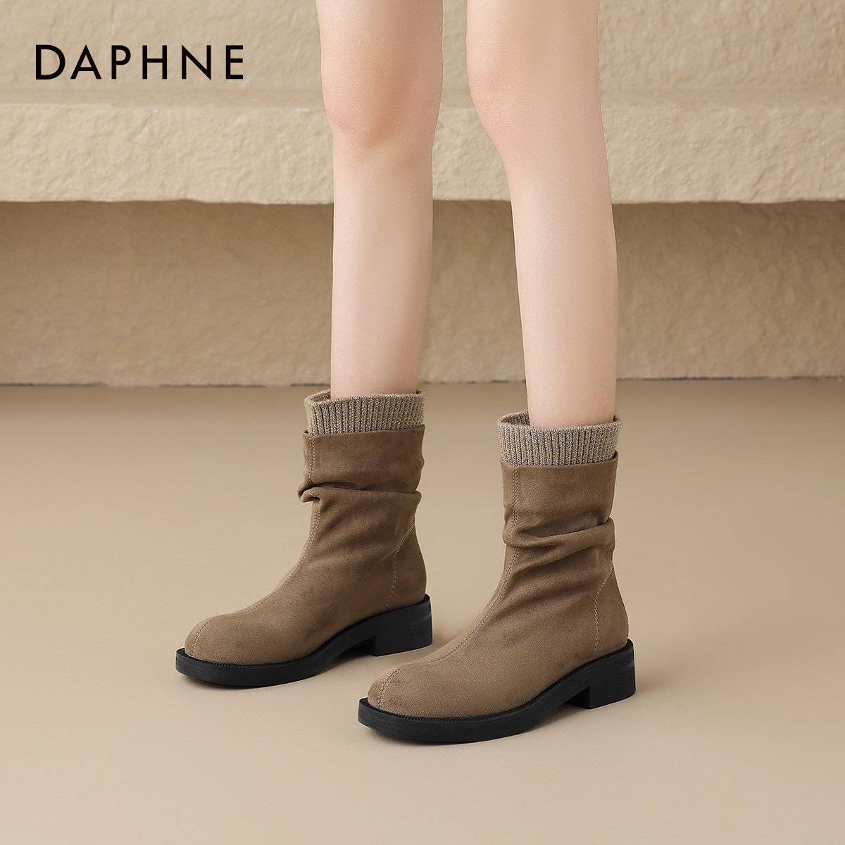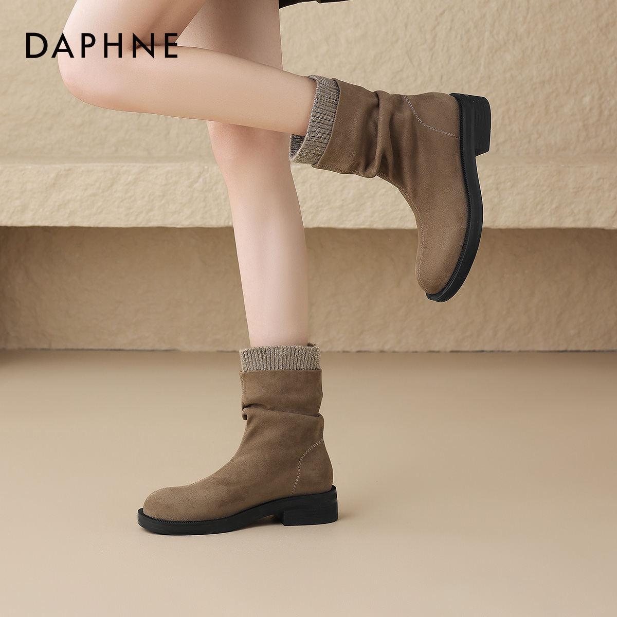 达芙妮靴子女春秋季短靴2025新款中筒堆堆靴西部牛仔靴平底马丁靴