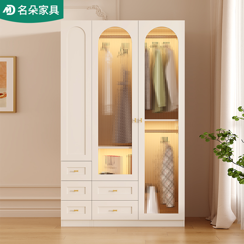 奶油风卧室衣柜家用大衣柜组合书柜储物衣帽柜落地带玻璃门5A43