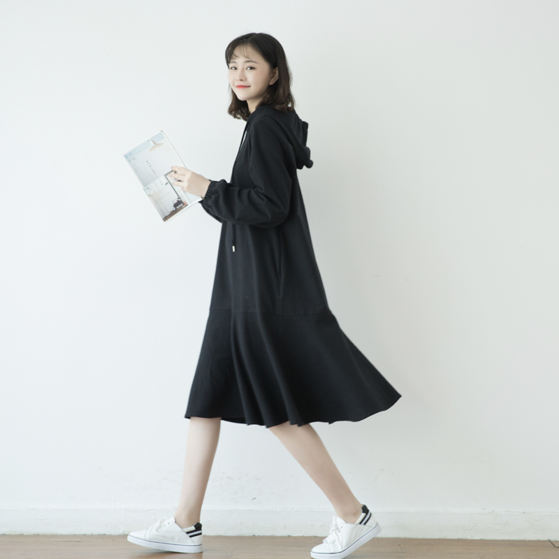SUIN2025春夏新文艺复古冷宽松连帽黑色长袖鱼尾中长款连衣裙975