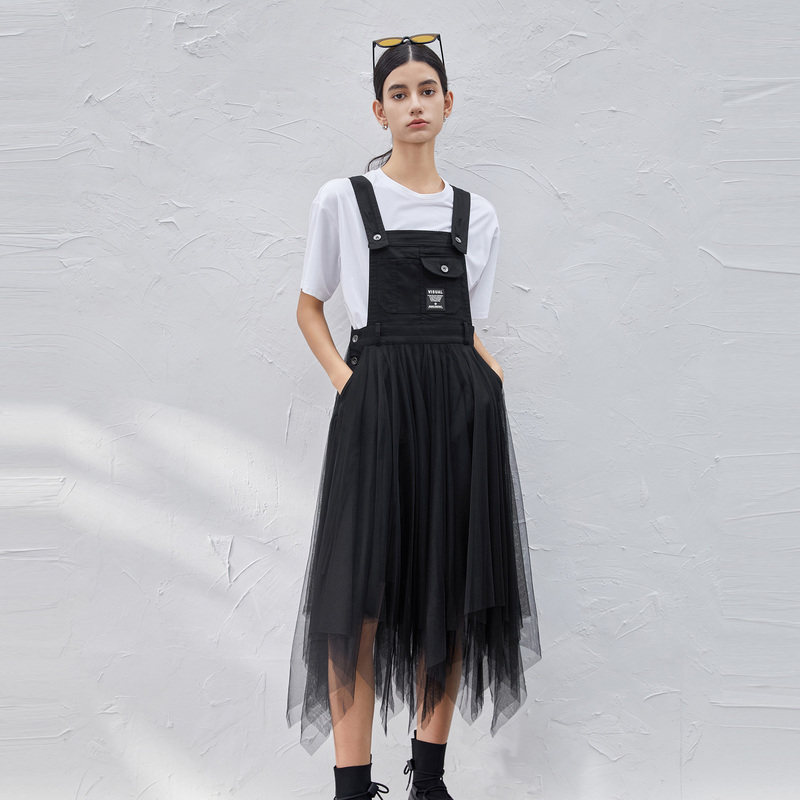 sdeer圣迪奥女装春秋装学院风字母网纱背带连衣裙S211T1207