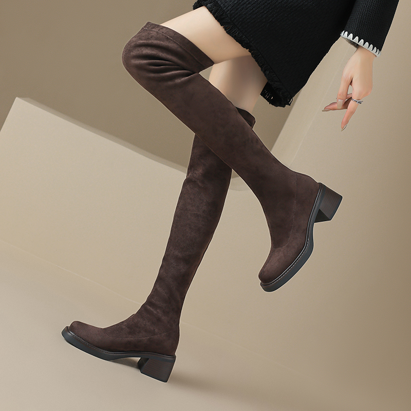 laydblack粗跟圆头弹力瘦瘦靴秋冬高跟过膝骑士靴子3340大码41-43