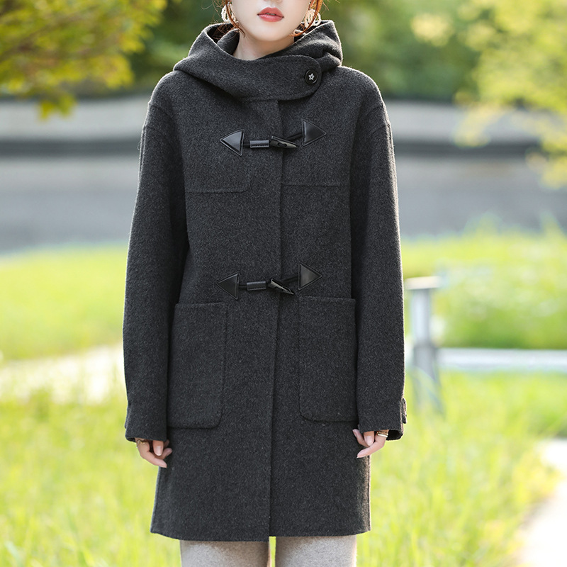 2024秋冬新款连帽牛角扣双面羊绒大衣女中长款韩系高级感羊毛外套