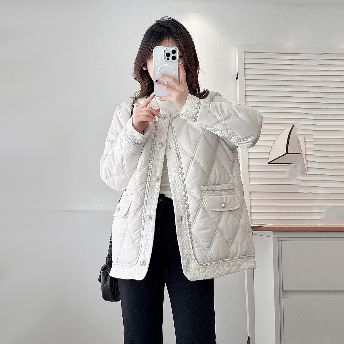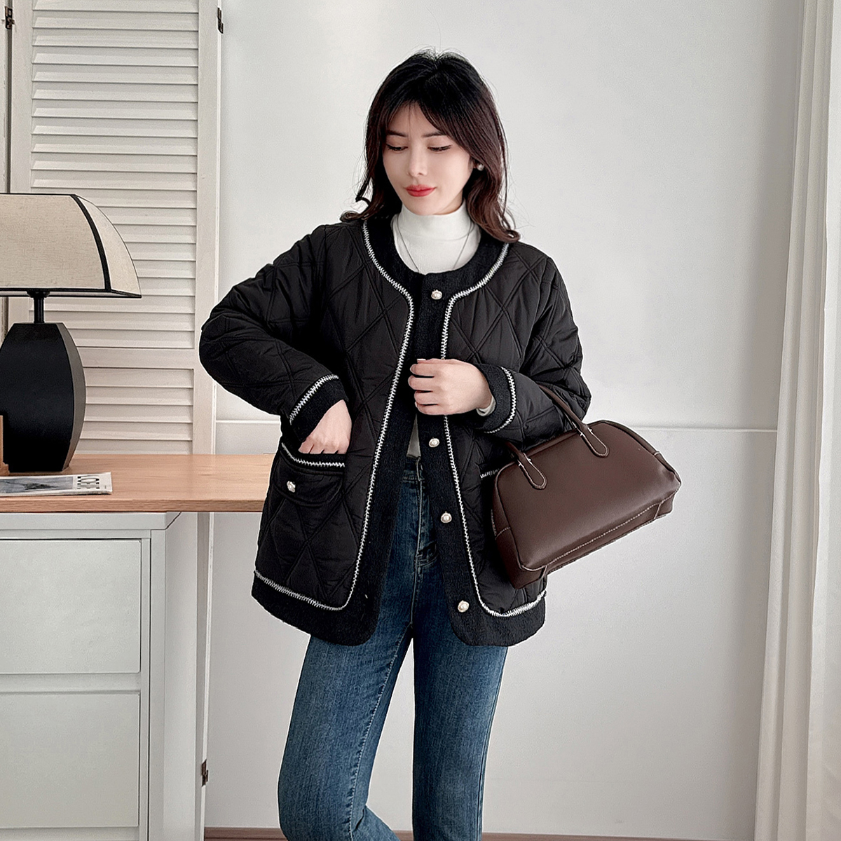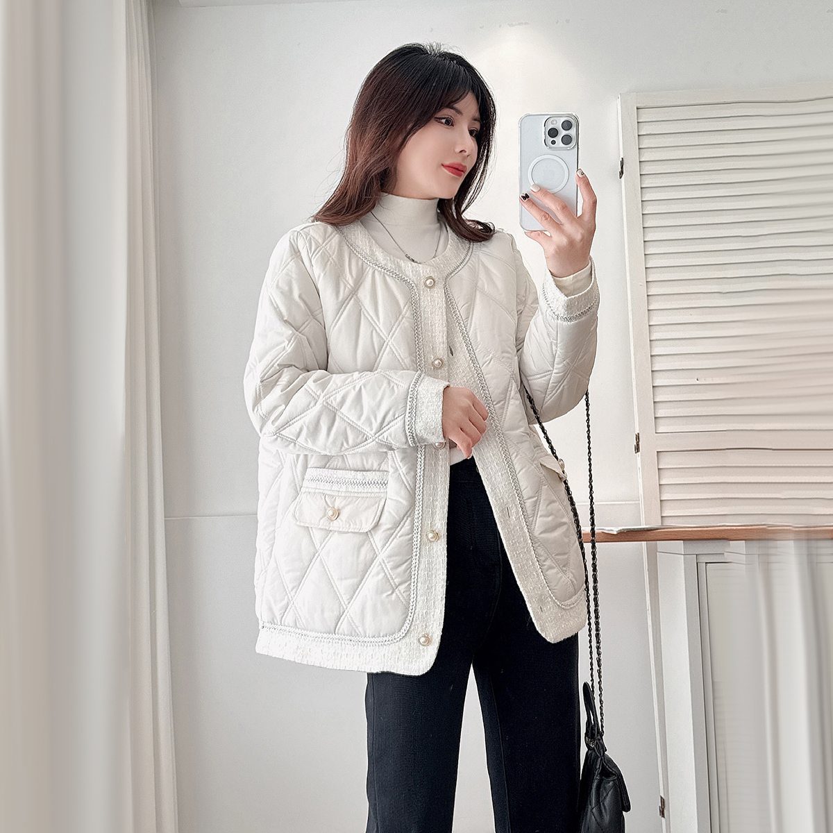 大码胖mm小香风菱格轻薄款棉衣女