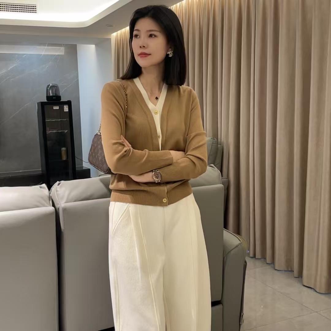 欧洲秋季新款设计感V领假两件温柔撞色软糯羊毛针织开衫外套女装