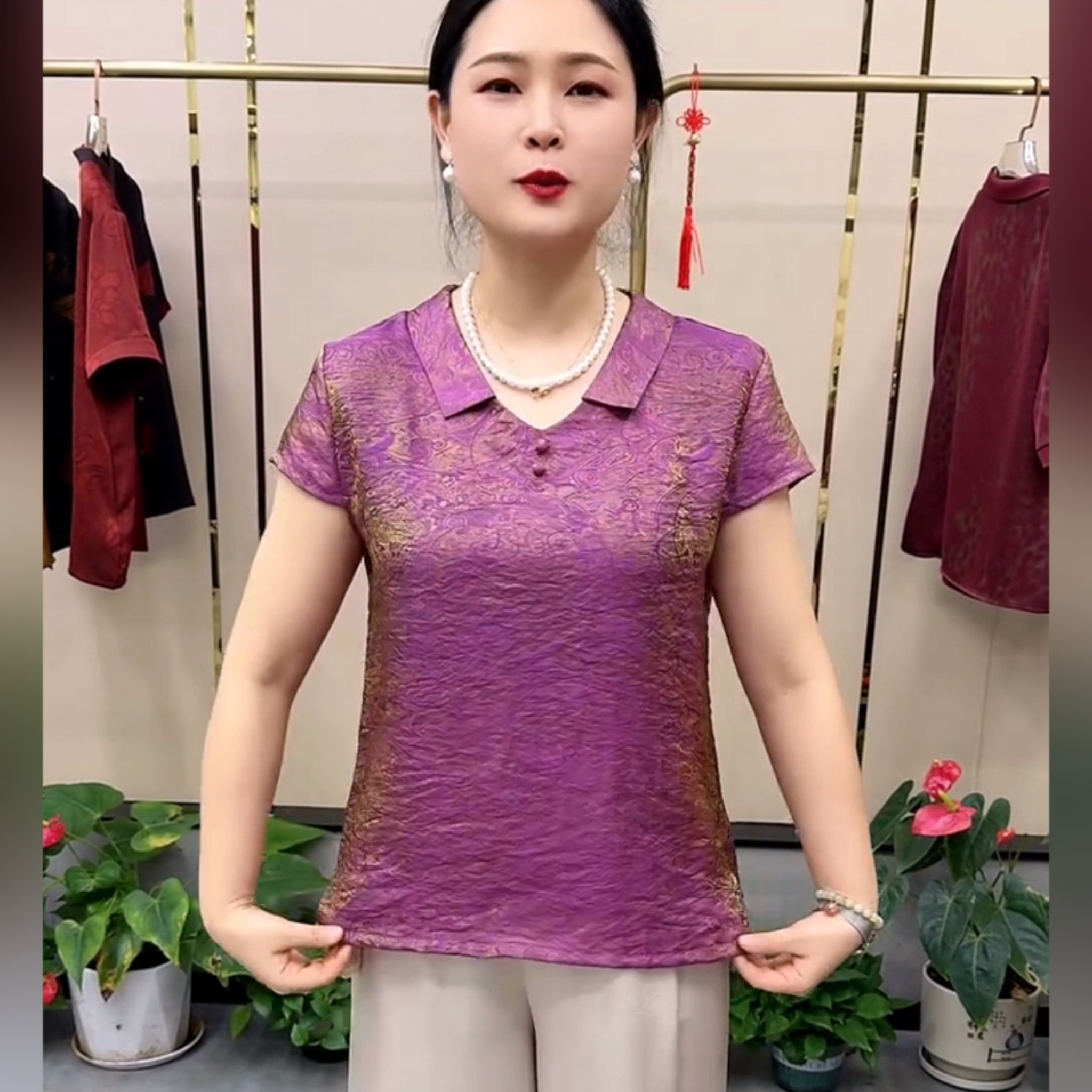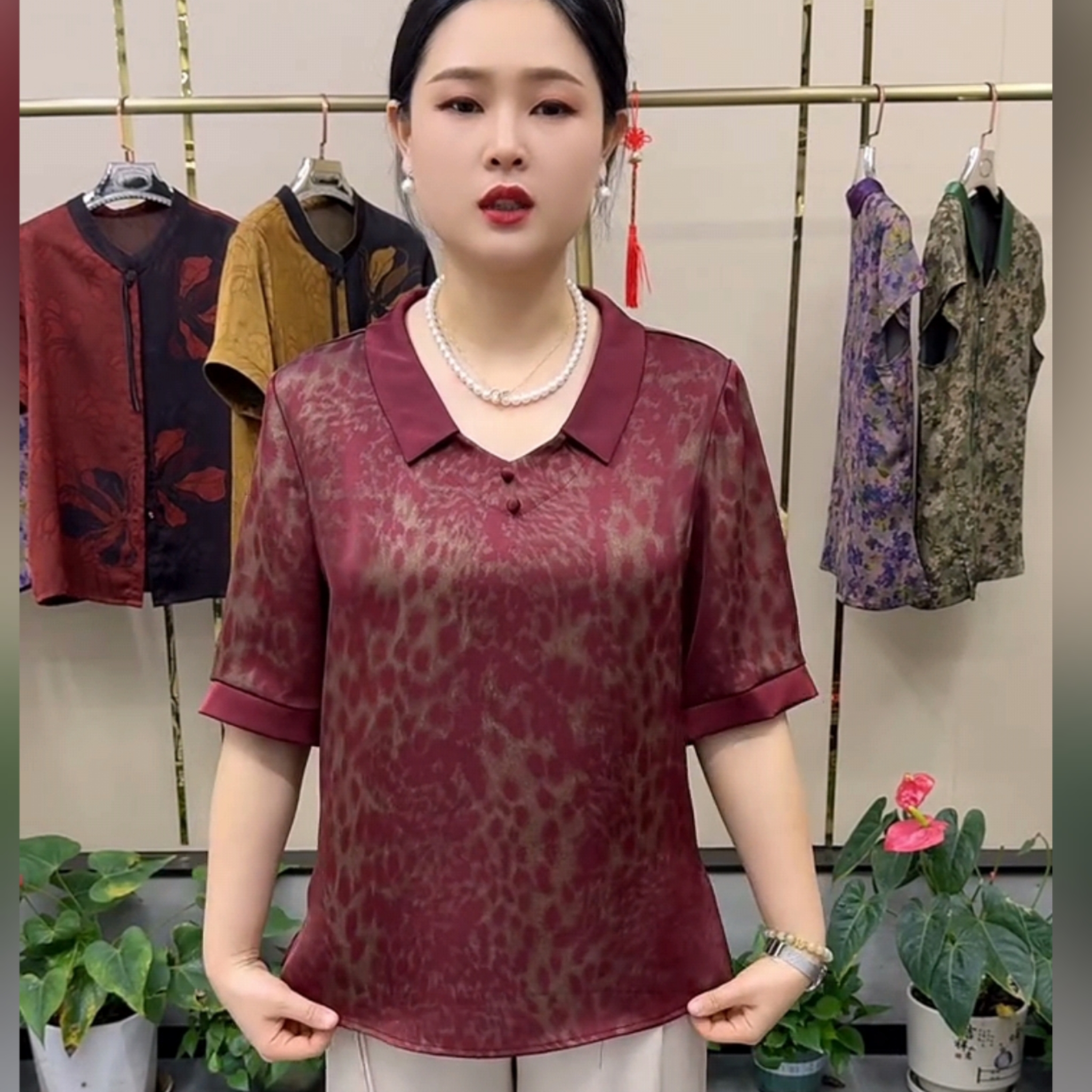真丝缎翻领短袖小衫女夏季新款中老年妈妈时尚遮肉T恤大码上衣薄