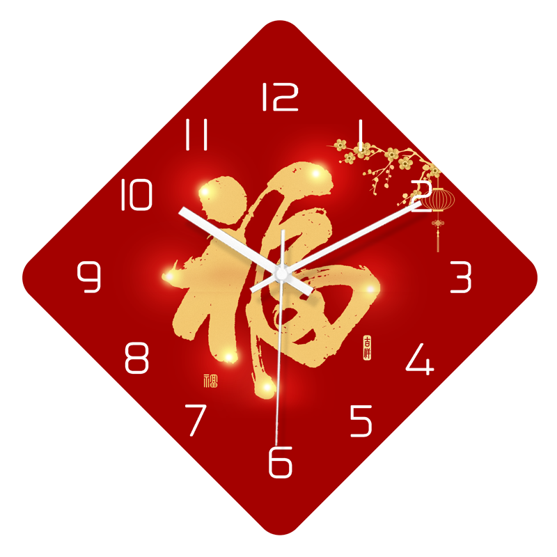 新中式喜气福字钟表挂钟客厅现代简约大气菱形静音家用挂墙时钟表
