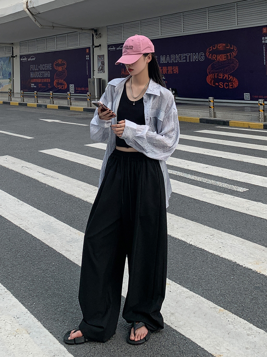 SIXI四喜家春夏 皮抽绳休闲长裤女宽松显瘦慵懒垂感肥佬裤阔腿裤
