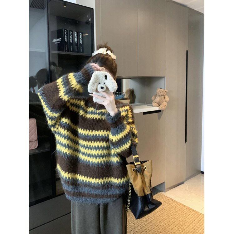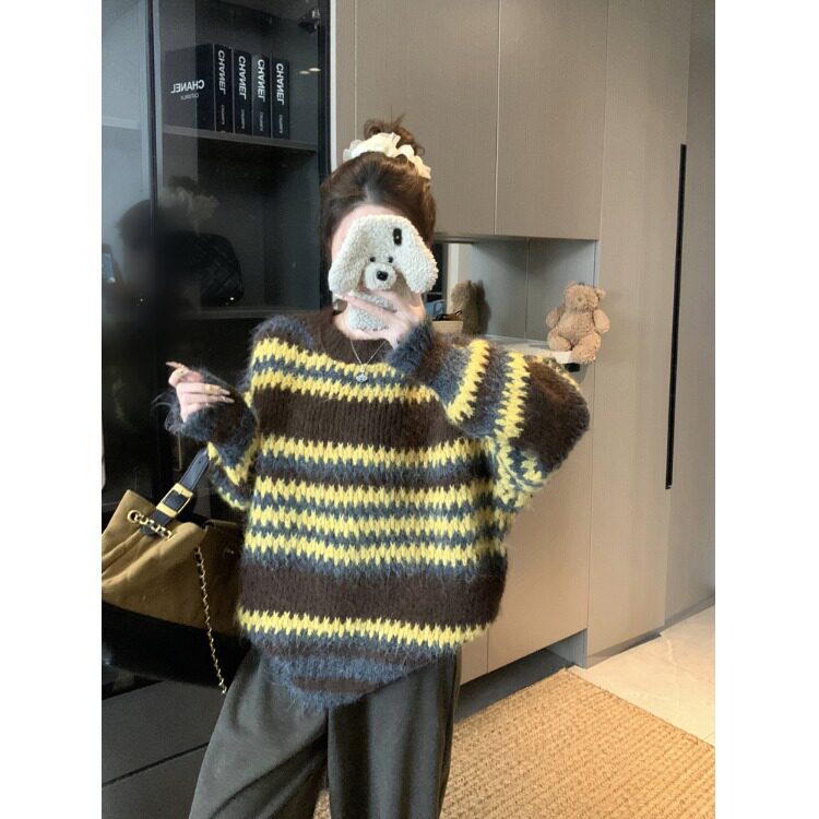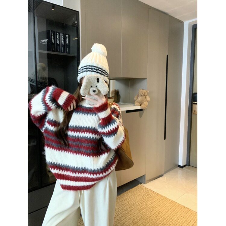 费尔岛撞色红色条纹毛衣女秋冬款慵懒宽松圆领套头韩系针织衫上衣