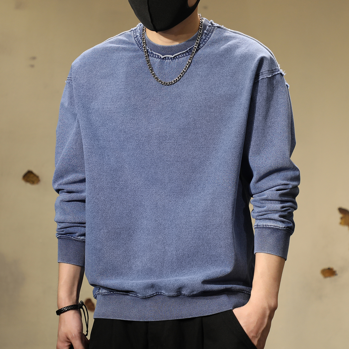 美式重磅水洗针织牛仔卫衣男秋季新款宽松休闲百搭长袖上衣外套潮