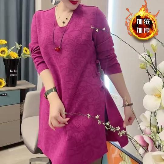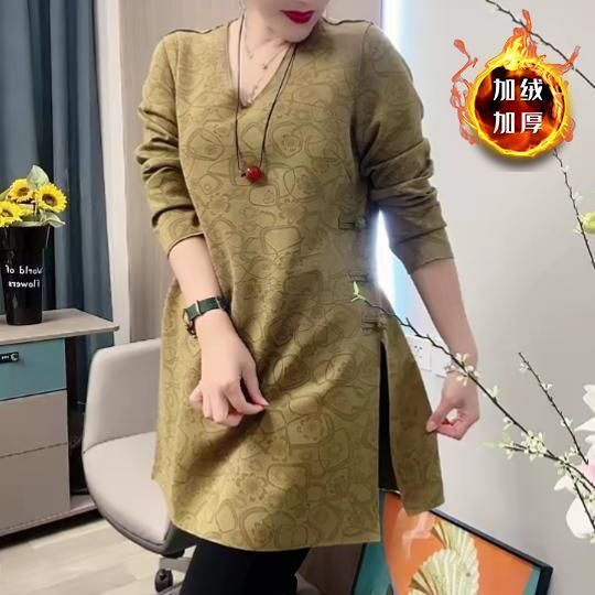 2025年秋冬新款大码V领时尚t恤女宽松显瘦盘扣中长款百搭打底上衣