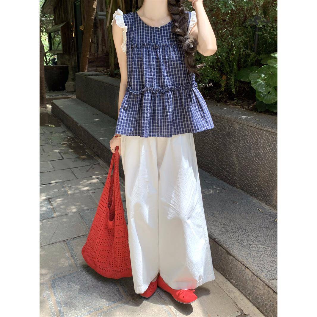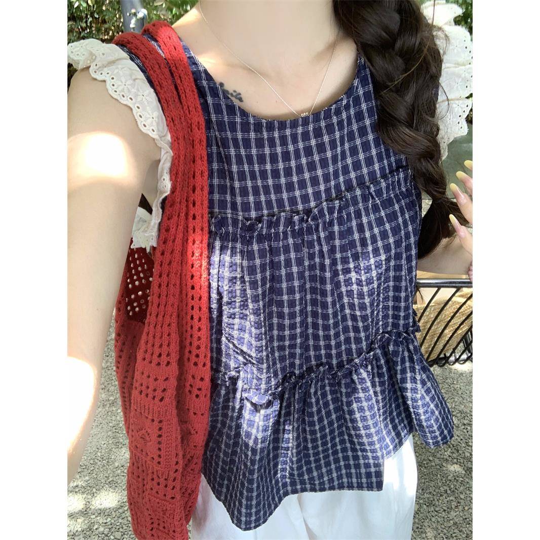 款子小飞袖短棉上衣女夏麻日2025新款法式娃娃格衫独特漂grp亮小