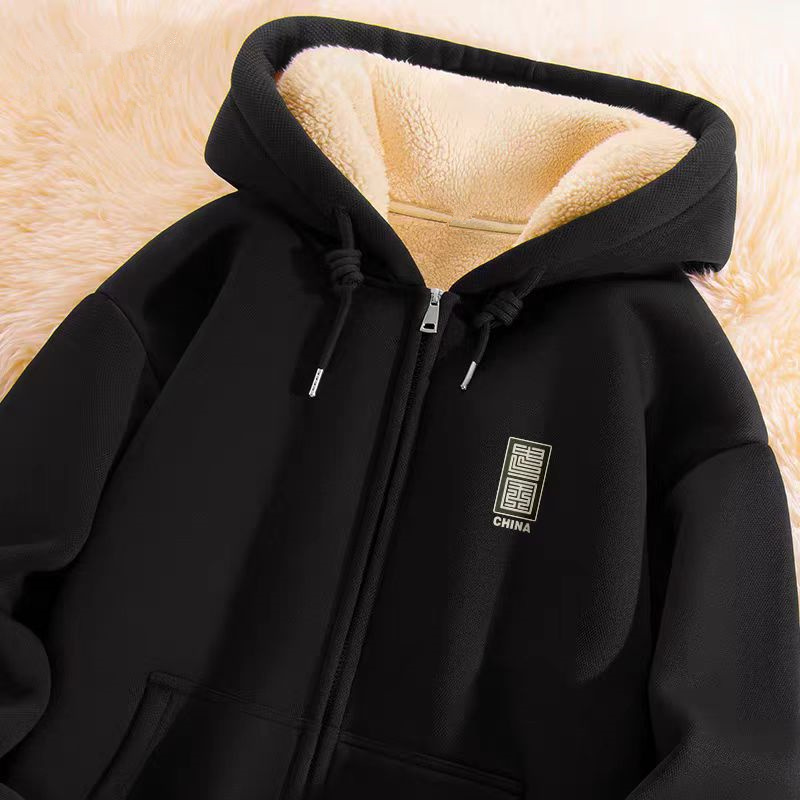 外套2025新款开衫保暖羊羔绒连帽衫加绒加厚冬季棕榈绿卫衣男12