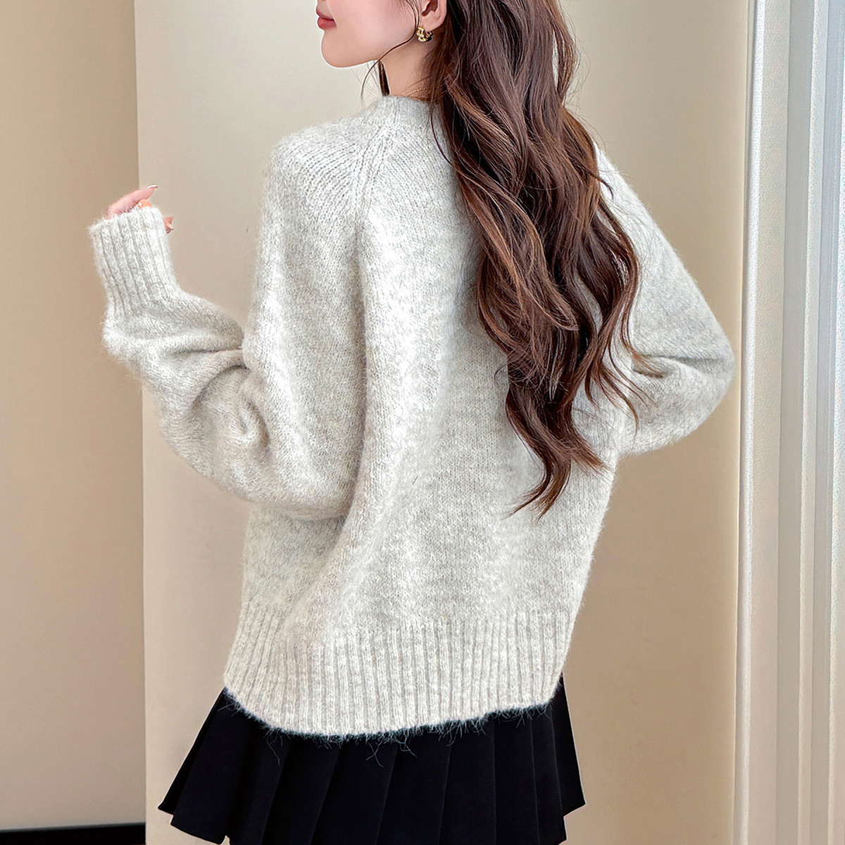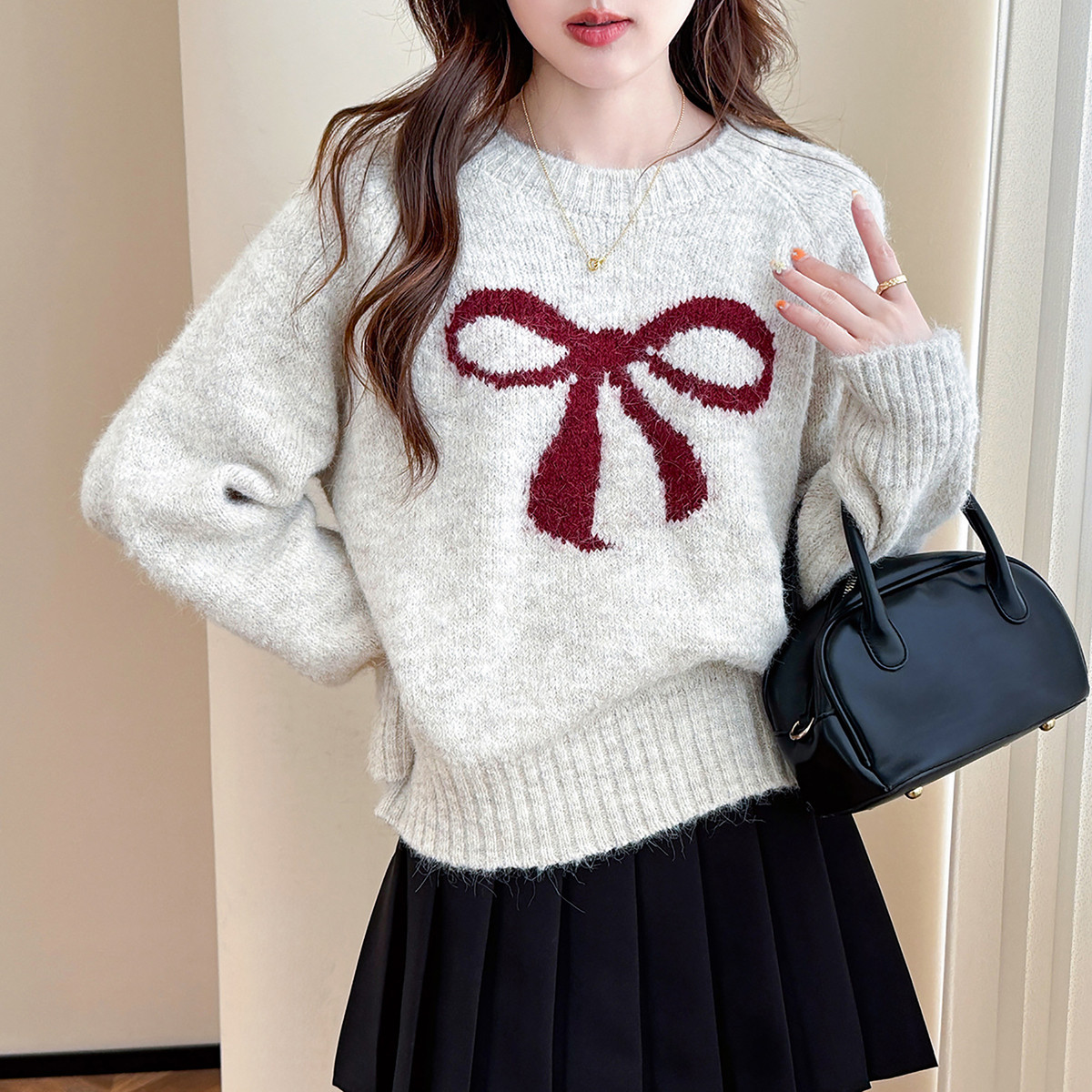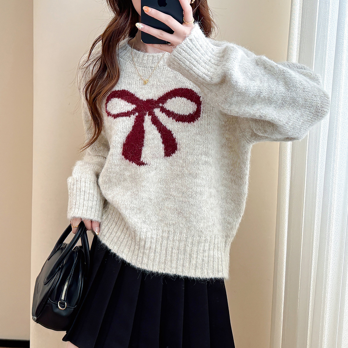唐狮2025秋冬新款女毛衣蝴蝶结图案圆领套头时尚百搭可内搭打底女