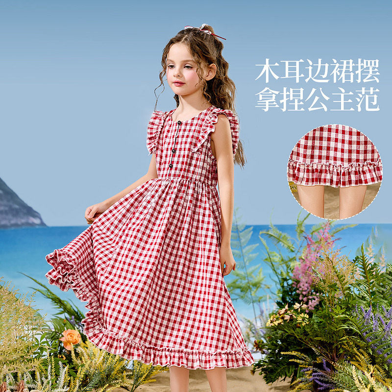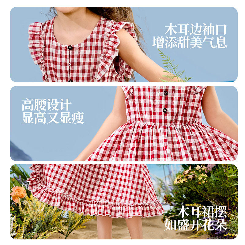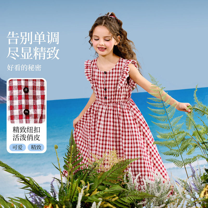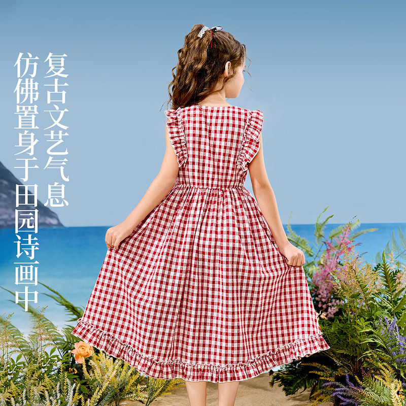 ask亲子裙装25夏季新品复古文艺风中大童格子设计连衣裙