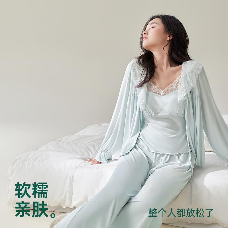 安之伴【巨柔软】睡衣女款春秋优可丝家居服带胸垫夏季吊带三件套