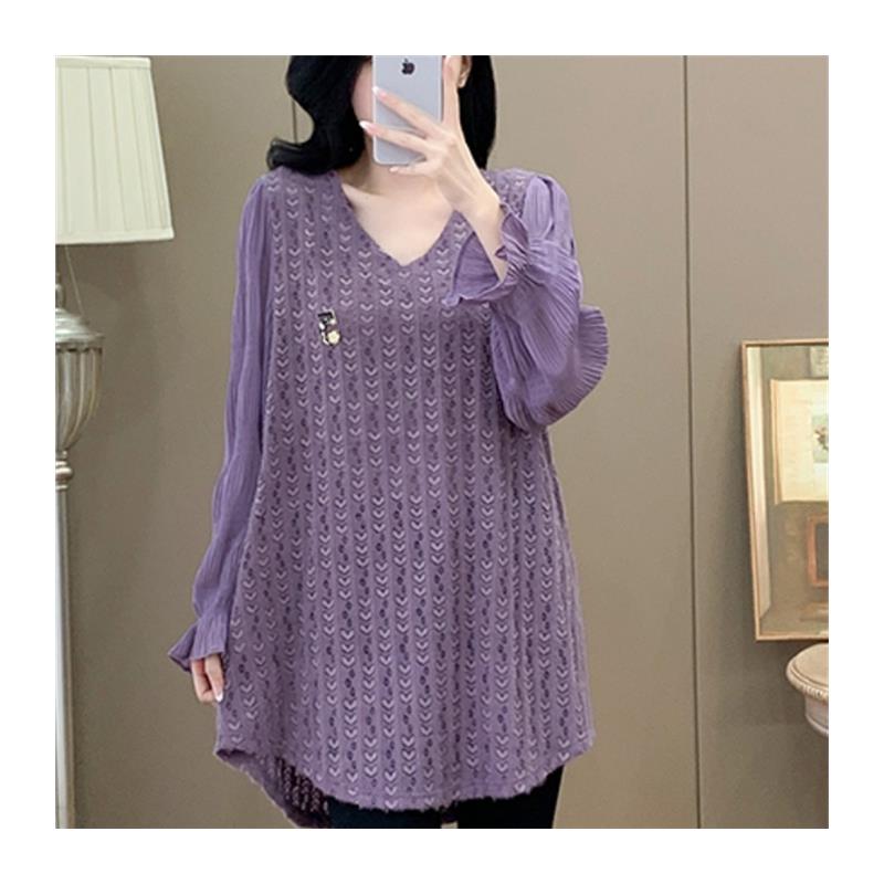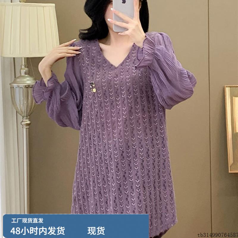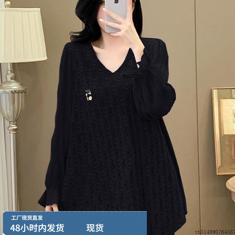 大码女装2025新款秋冬内搭打底衫中长款v领蕾丝衫百搭显瘦上衣潮