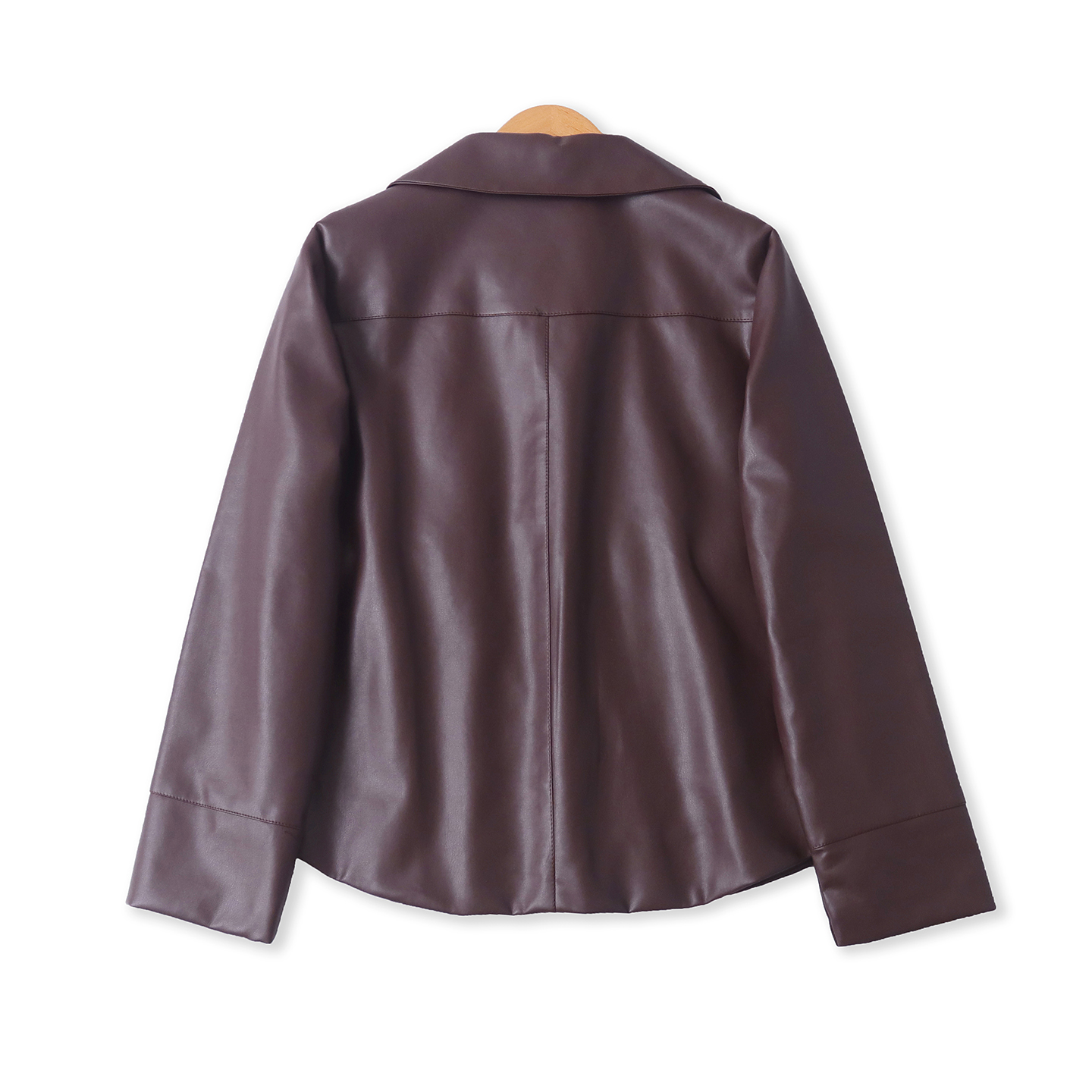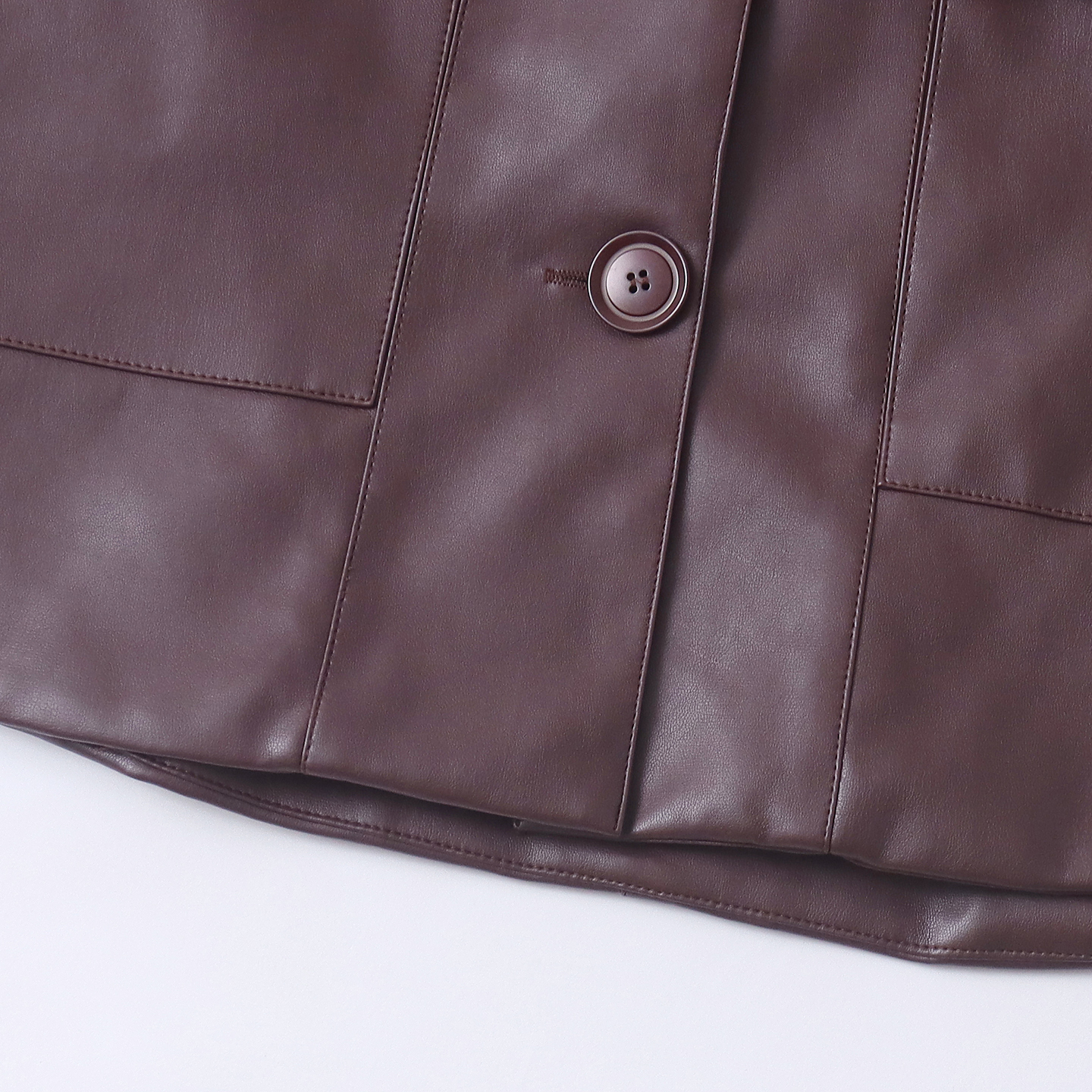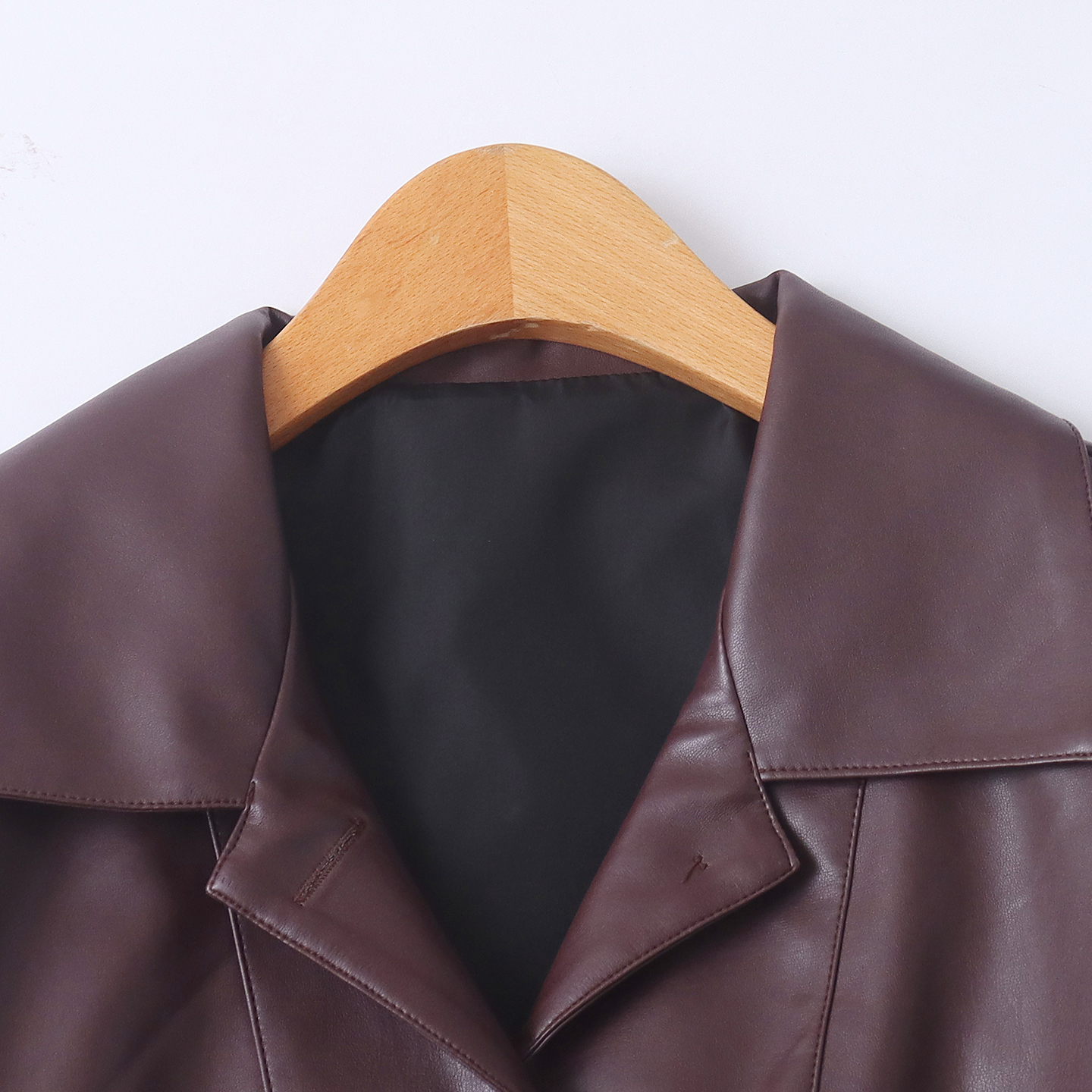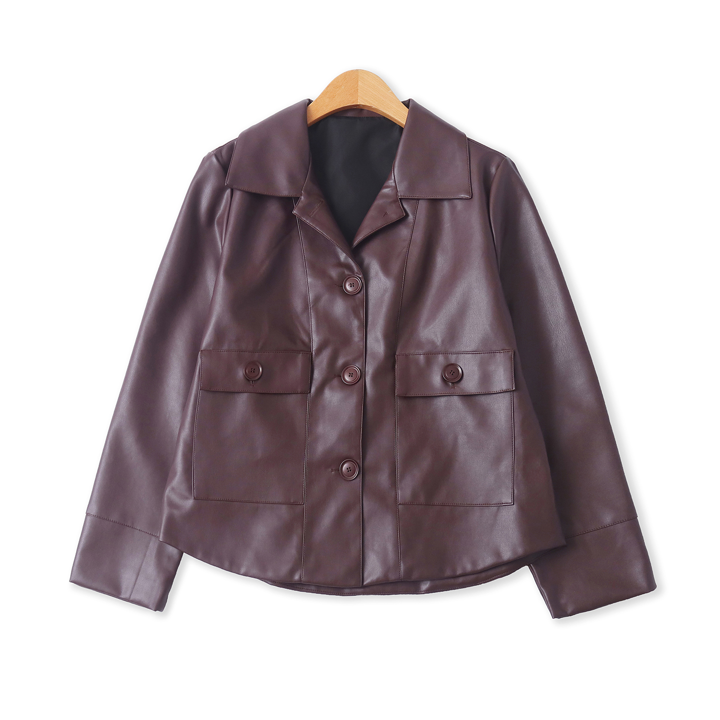 PU皮夹克秋季新款外贸女装纯色百搭翻领单排扣修身长袖外套18467
