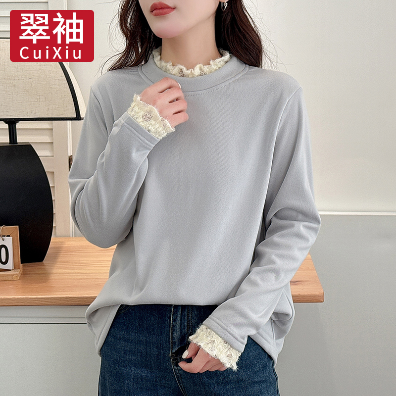 翠袖大码女装秋冬新款蕾丝拼接加绒打底衫女冬季胖mm德绒内搭上衣