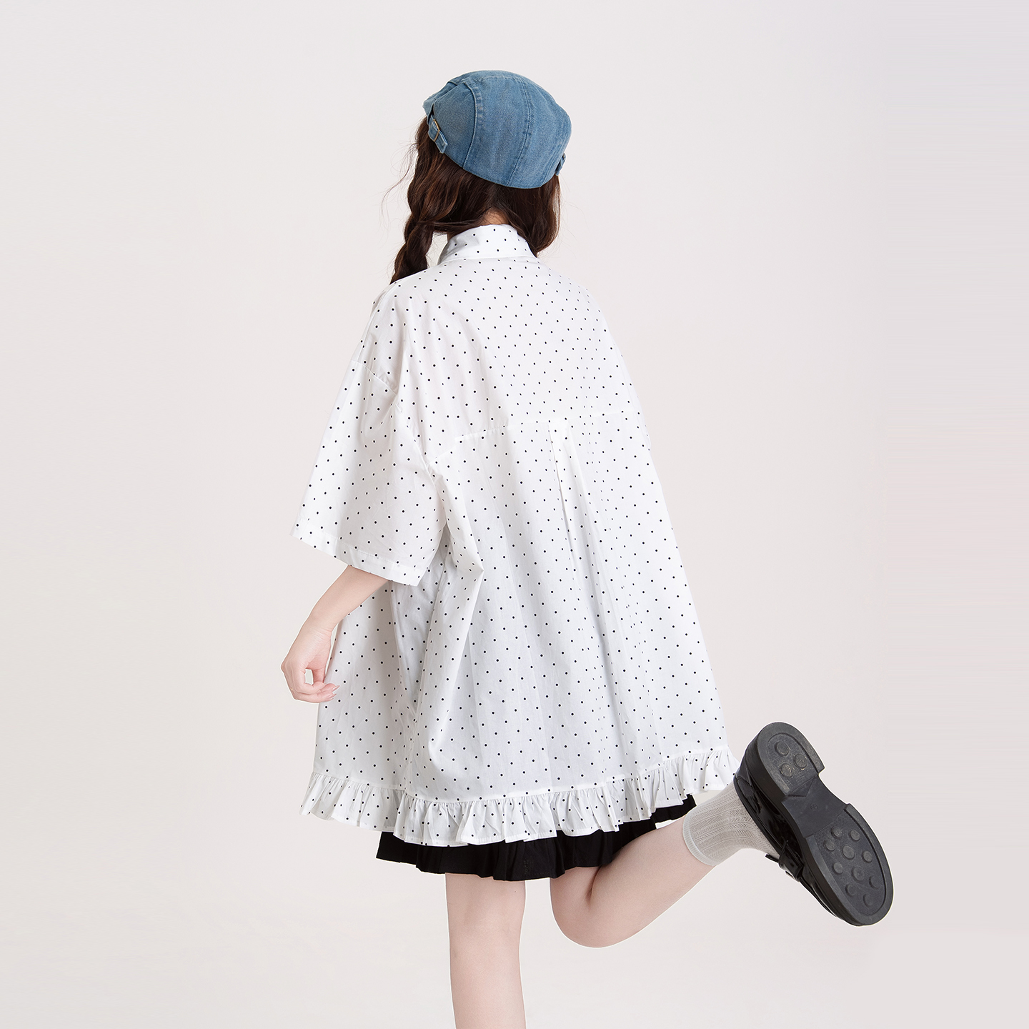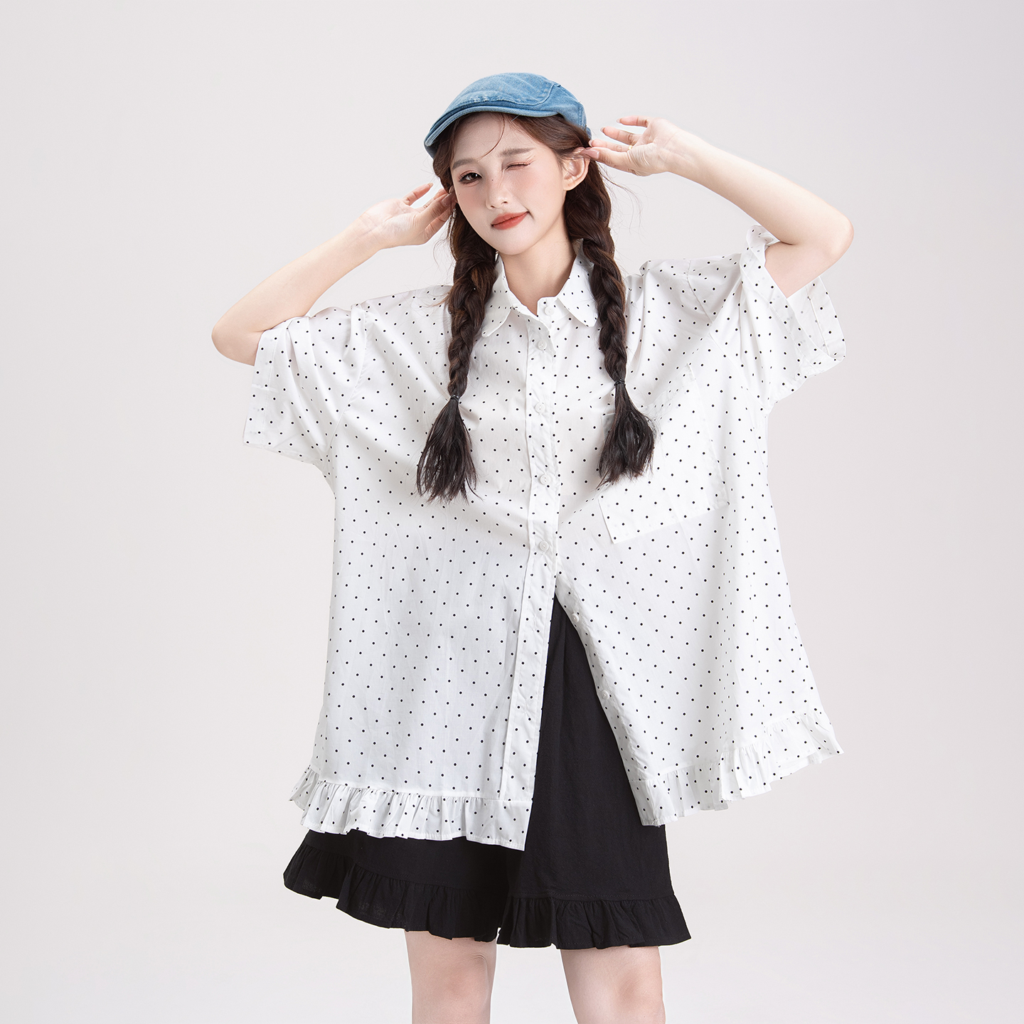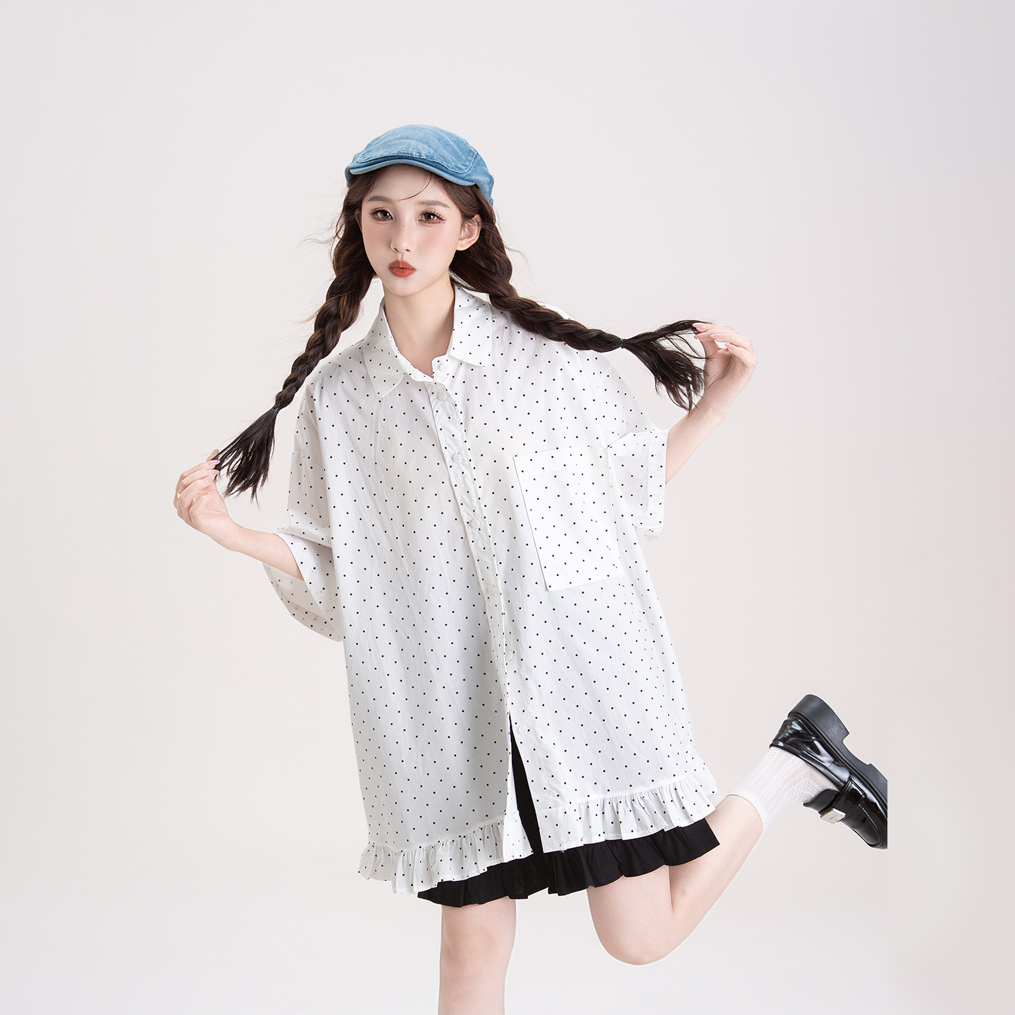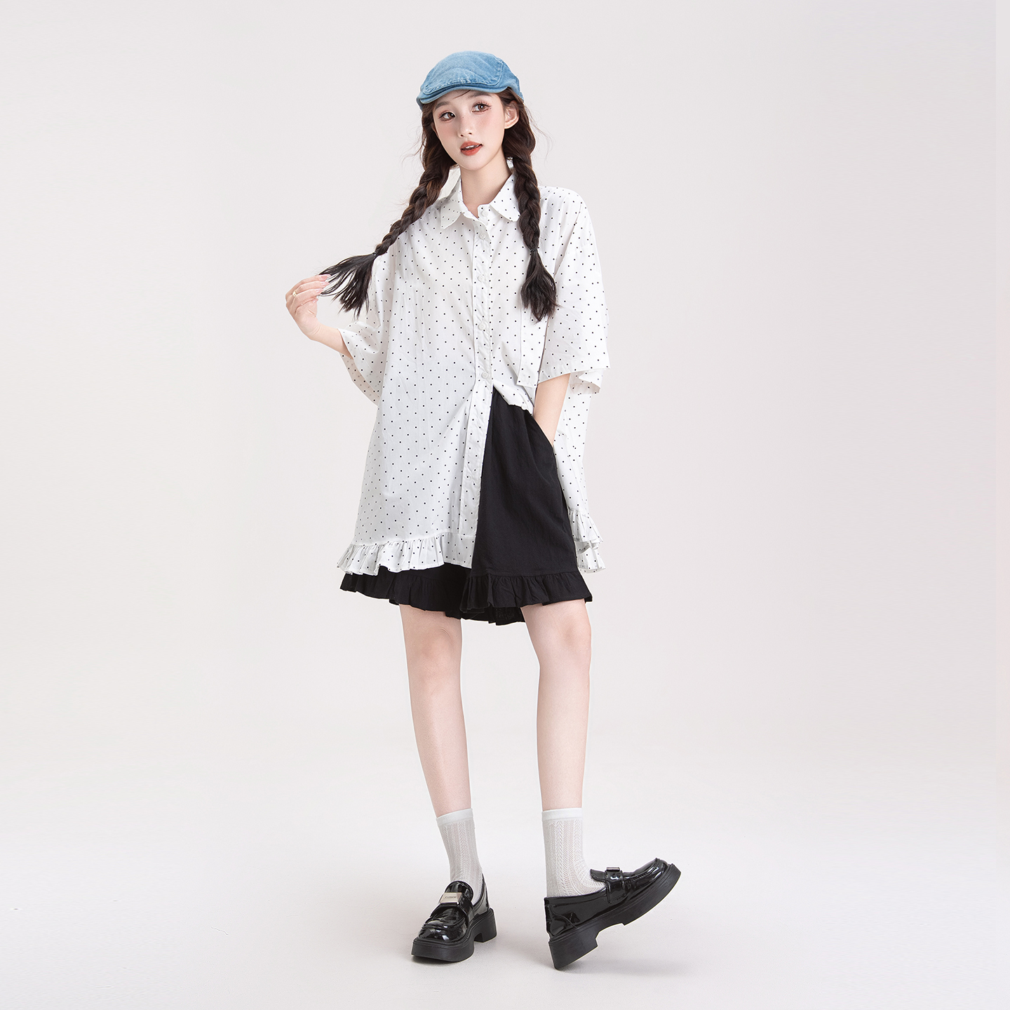 韩系设计感荷叶边波点百搭短裤休闲衬衫上衣女2025夏季新款套装潮