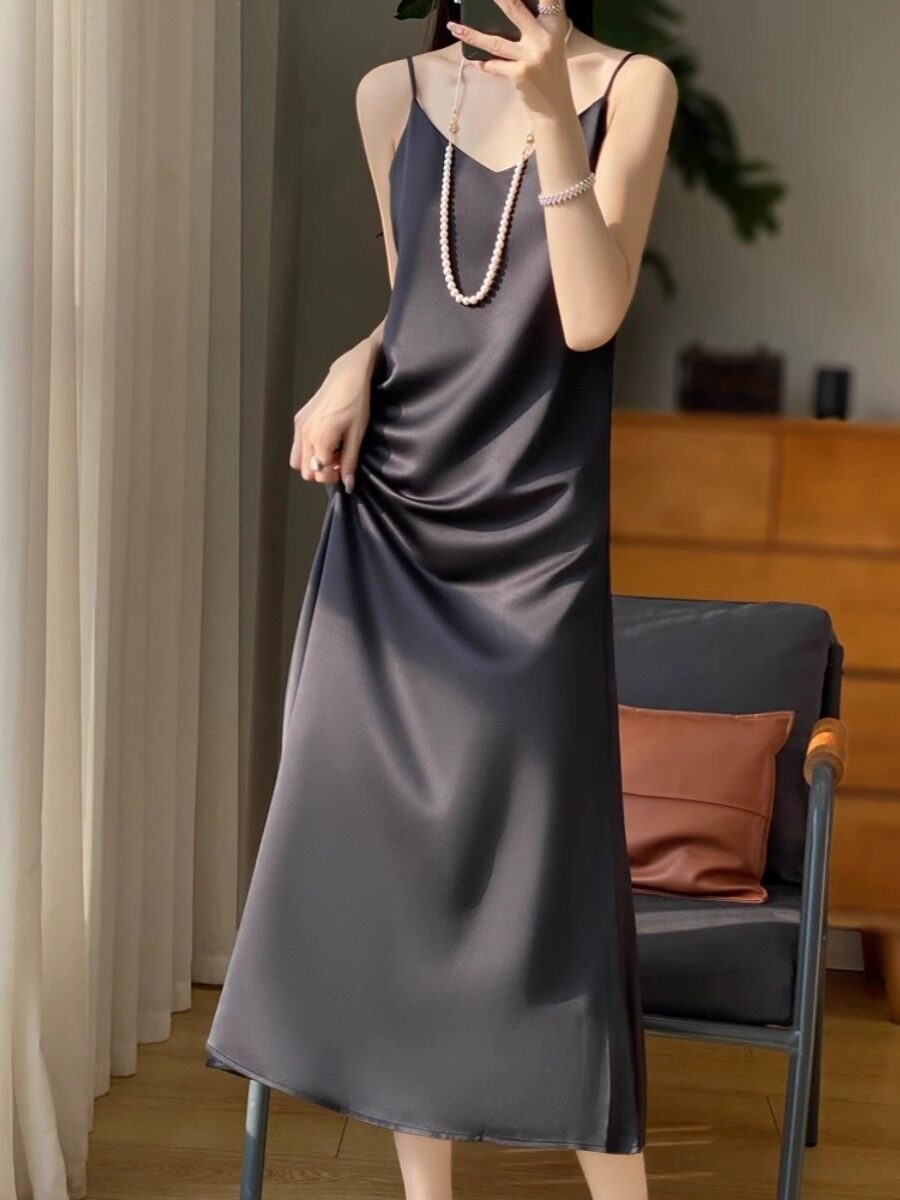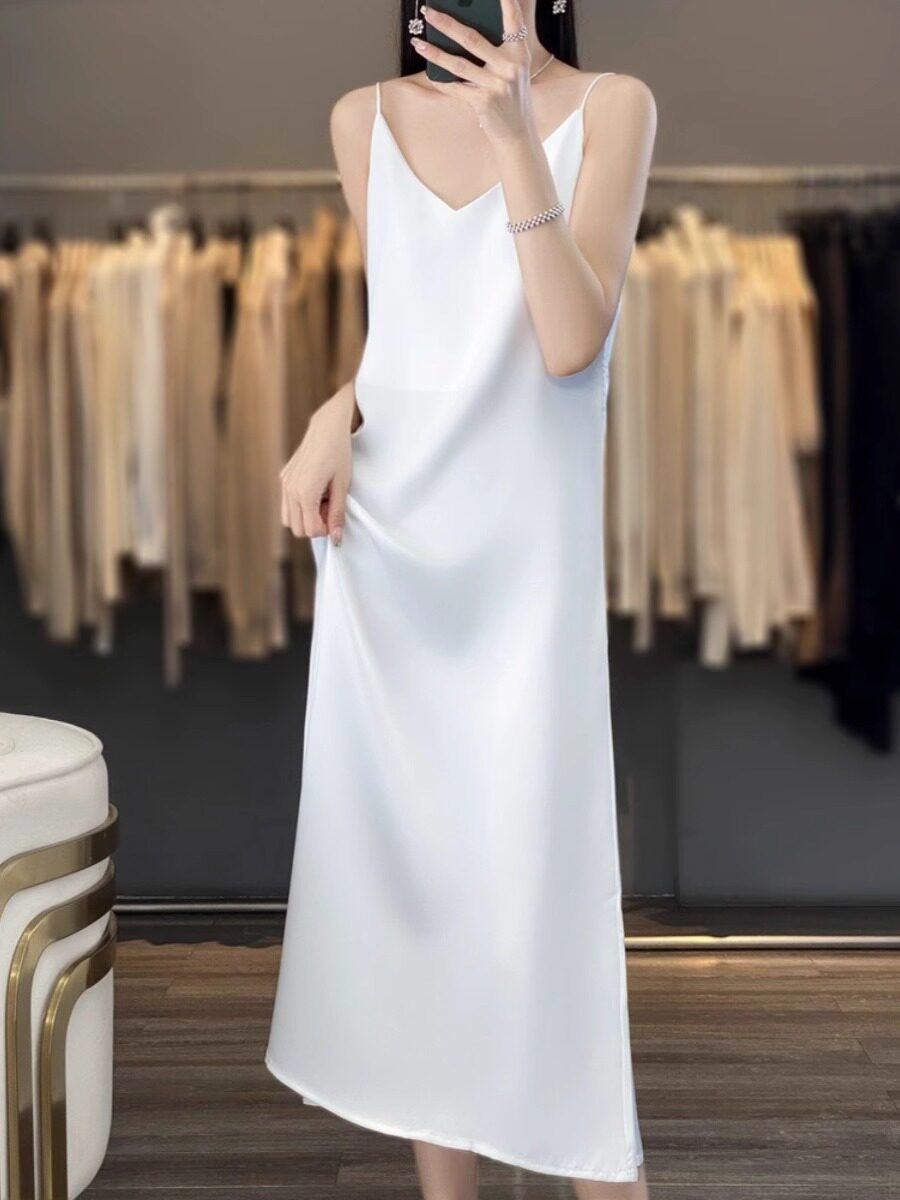 醋酸缎面吊带连衣裙女蚕丝V领夏高级感优雅气质遮肉显瘦真丝长裙
