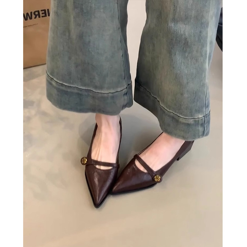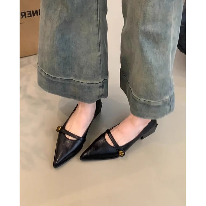 复古浅口高跟鞋女2025春季新款山茶花一字扣粗跟单鞋尖头玛丽珍鞋