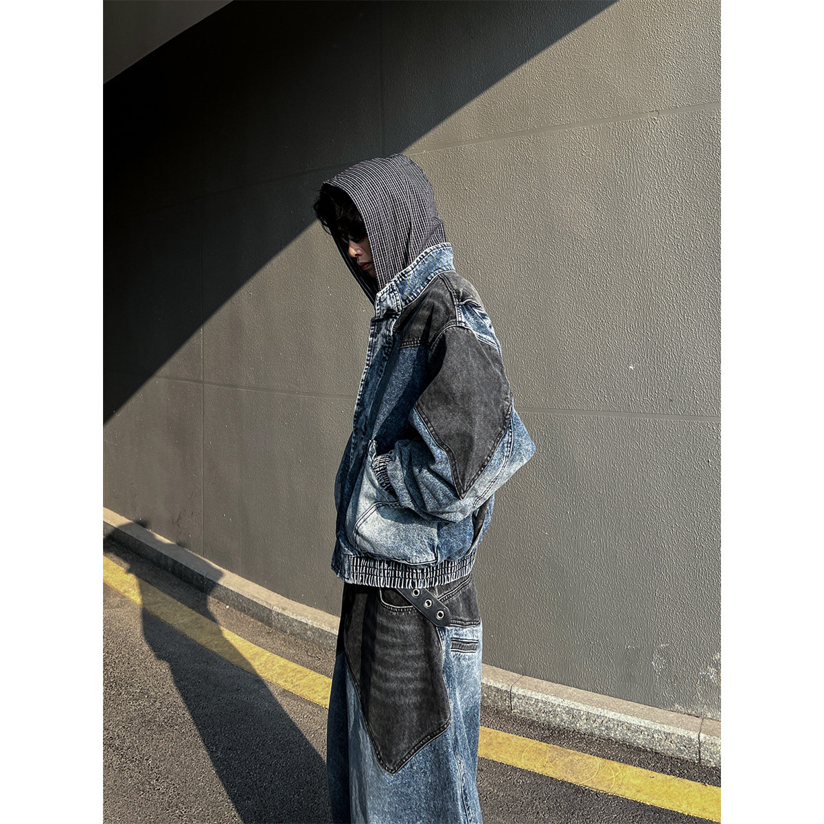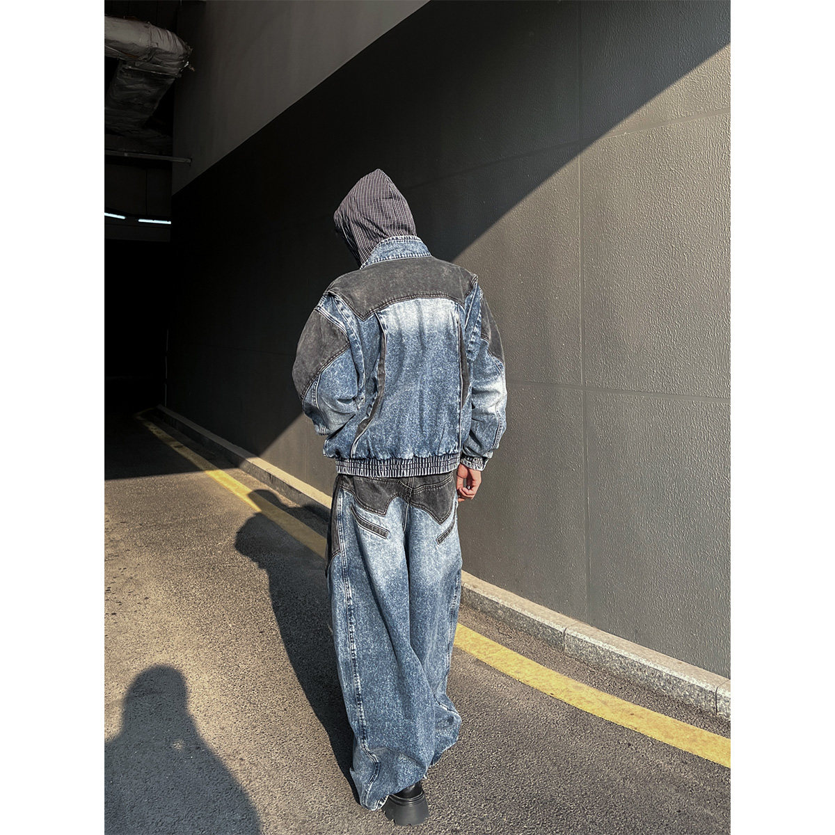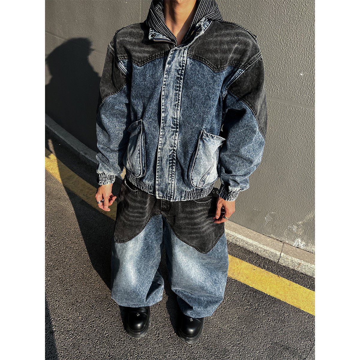 THREENINE复古拼接大口袋设计牛仔外套夹克男弯刀牛仔裤时尚套装