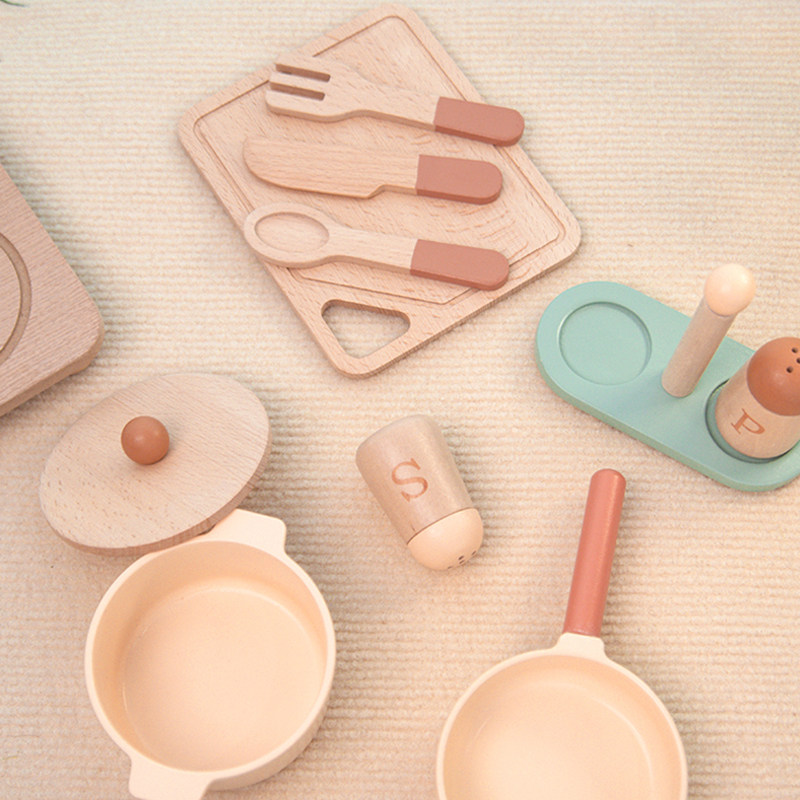 原木色烹饪锅具过家家玩具儿童厨房模拟炒菜幼儿榉木新品颜值精致