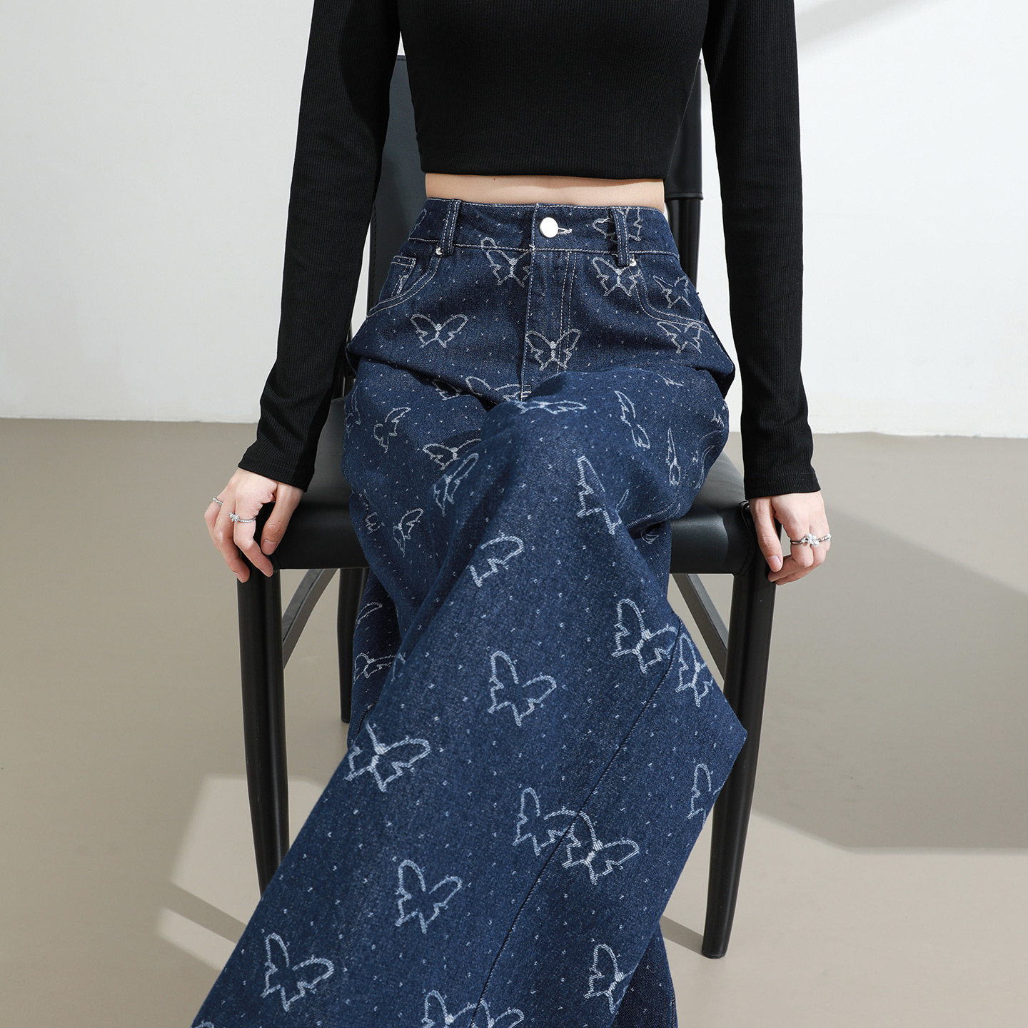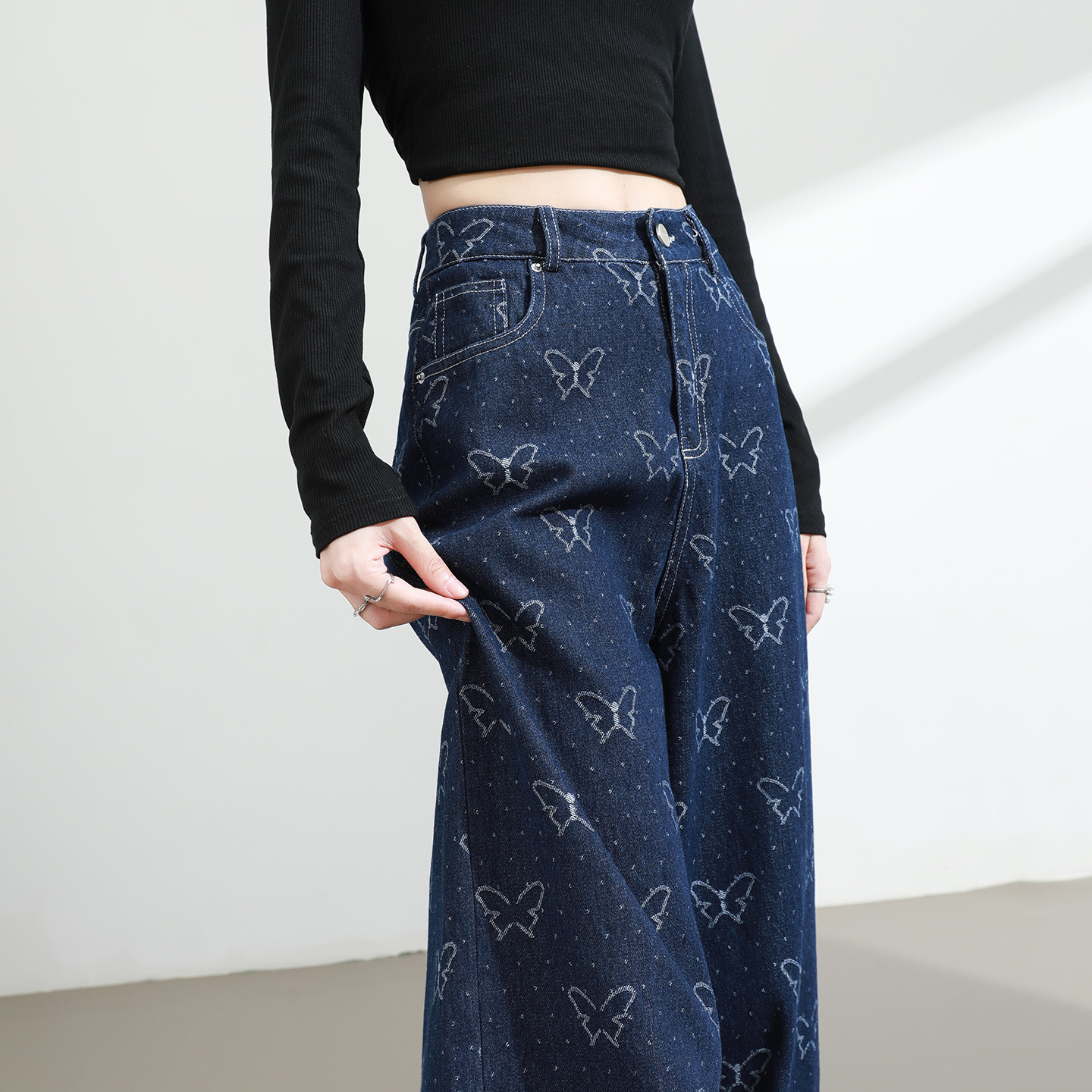 蝴蝶印花阔腿牛仔裤女2025春秋新款高腰宽松显瘦垂感直筒拖地裤子