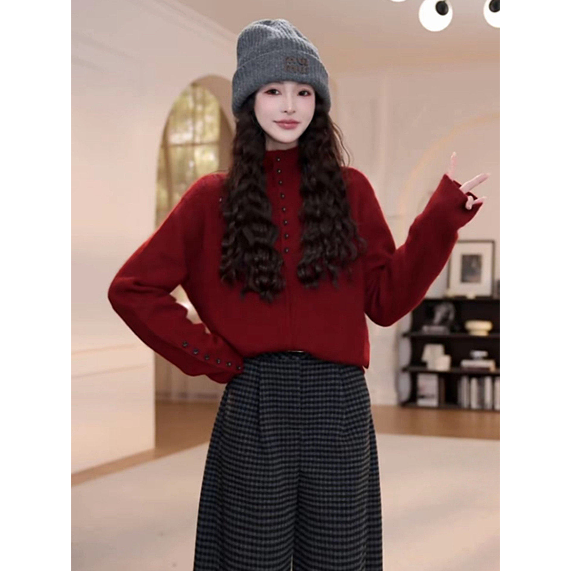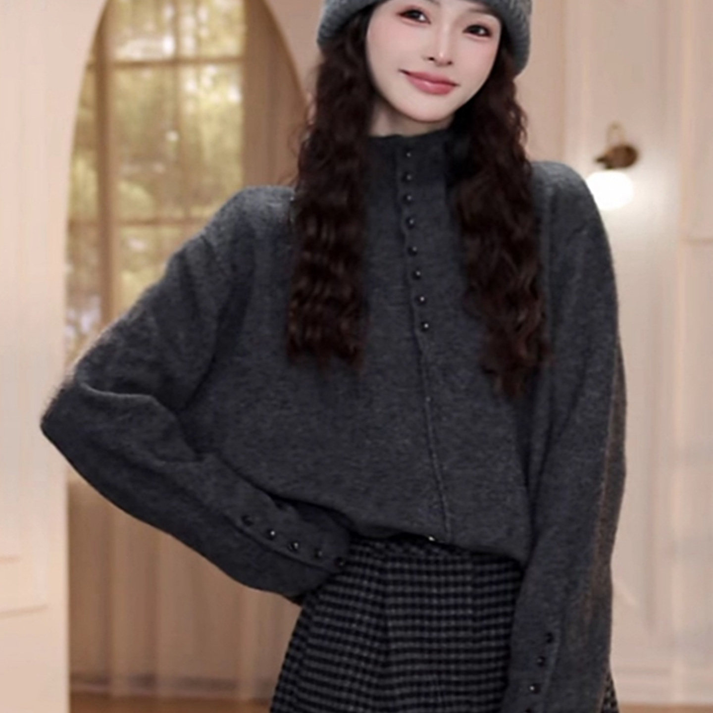 慵懒风灰色半高领排扣针织毛衣