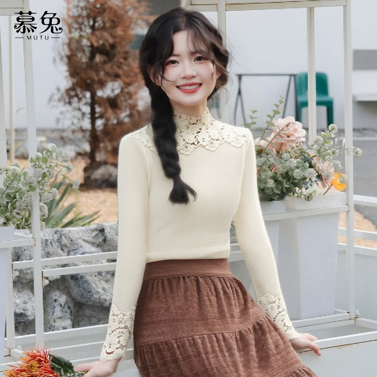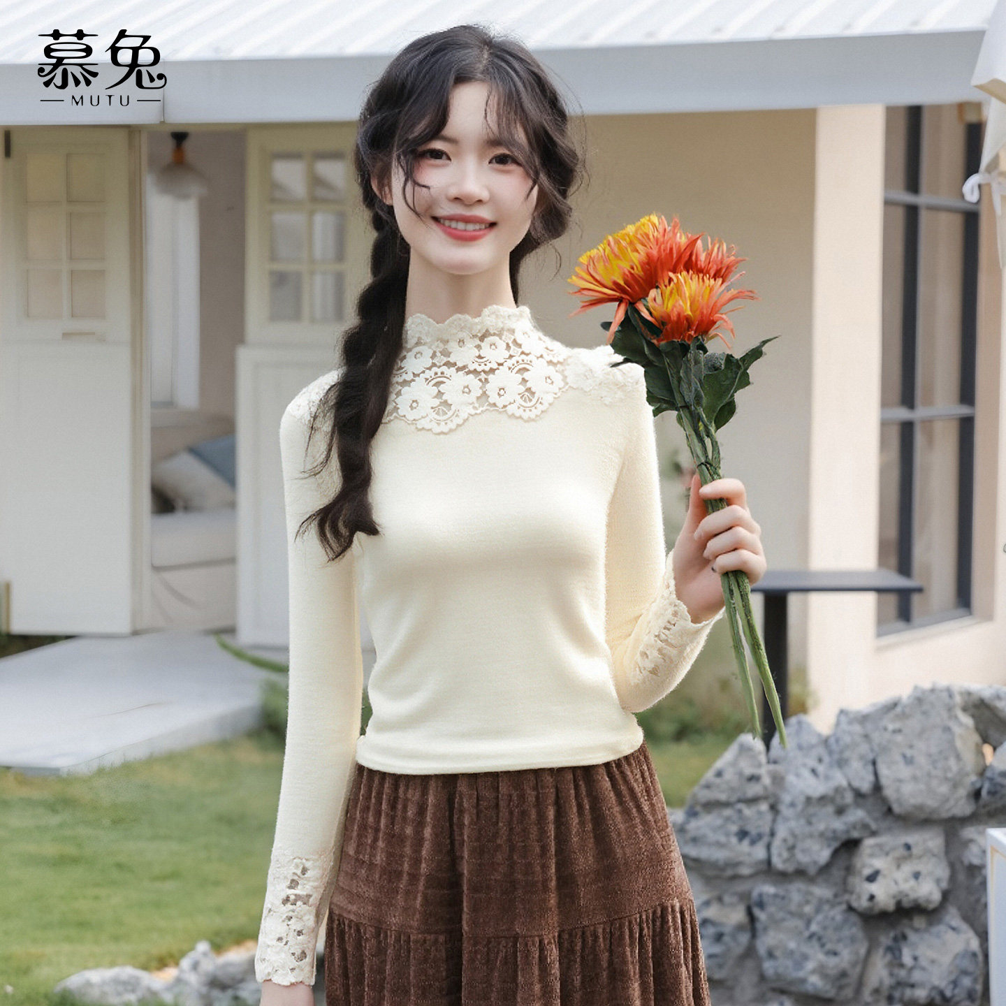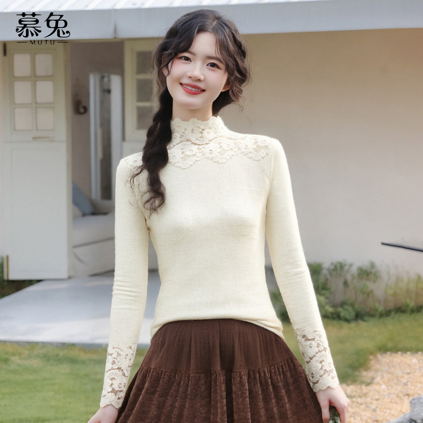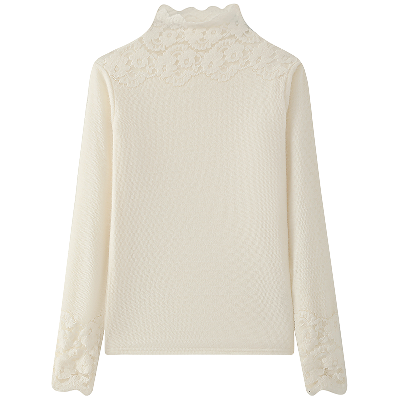 慕兔半高领蕾丝拼接长袖t恤