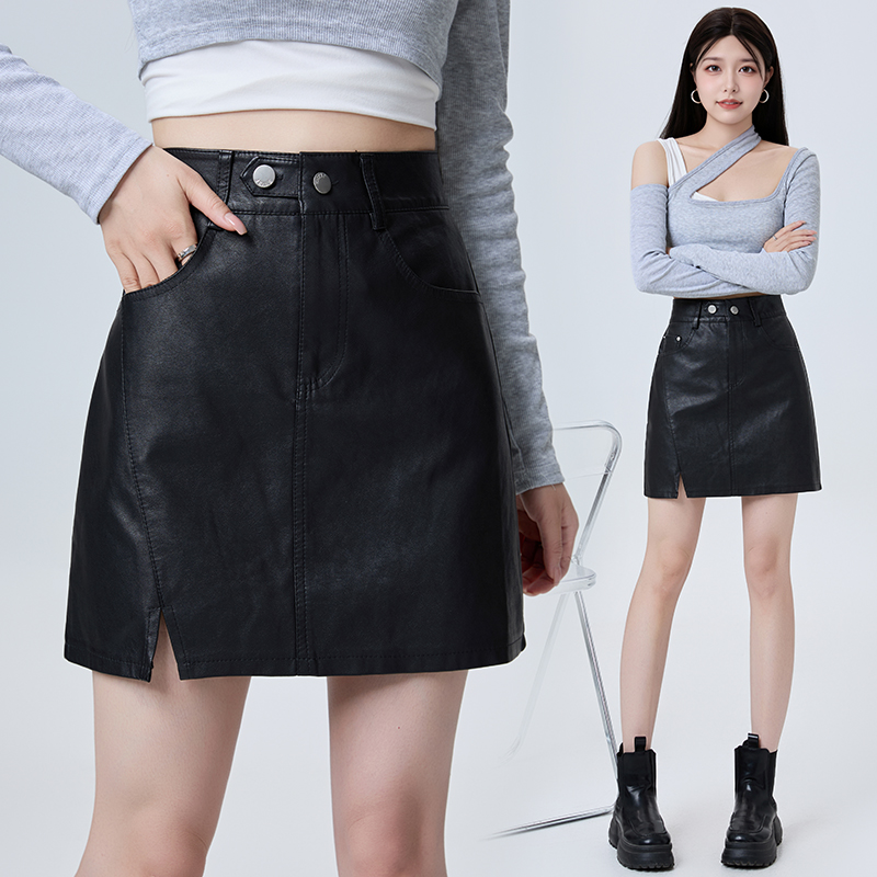 开叉PU皮裙女2025秋季新款高腰显瘦百搭A字包臀半身裙短裙