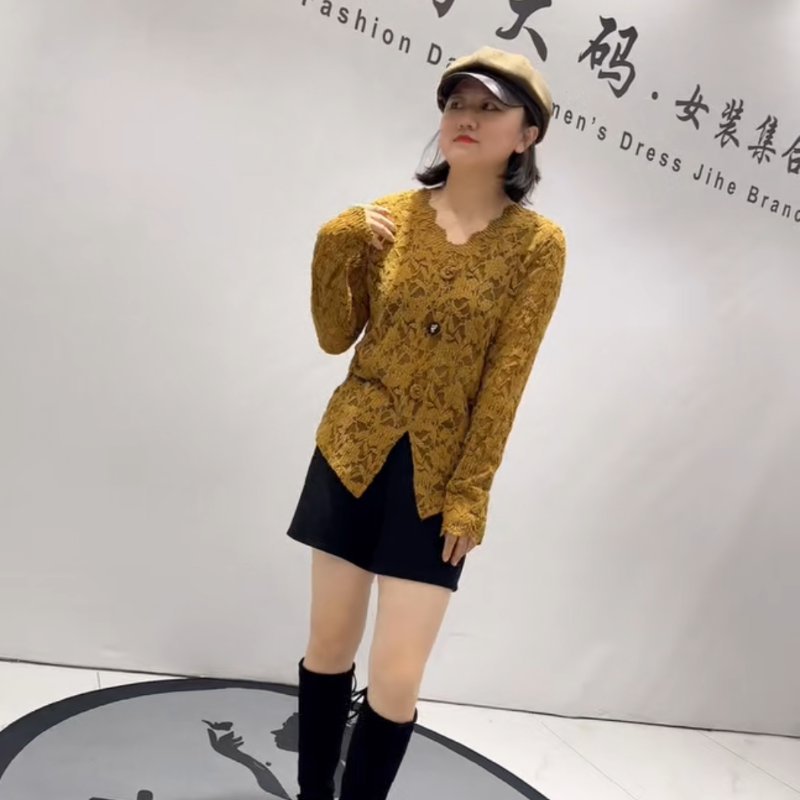 针丝缘子汇1048秋冬新款V领蕾丝打底衫加大码女装胖妹妹减龄上衣