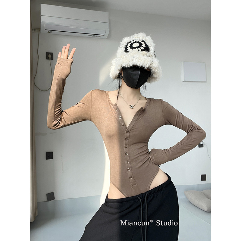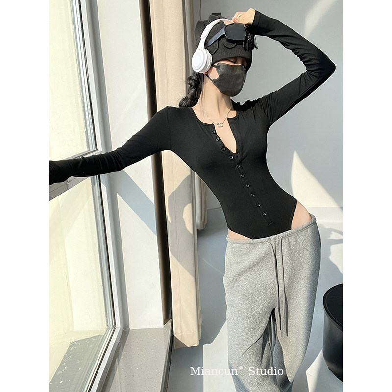 MianCun美式亨利领白色修身长袖T恤女秋季新款紧身连体上衣打底衫