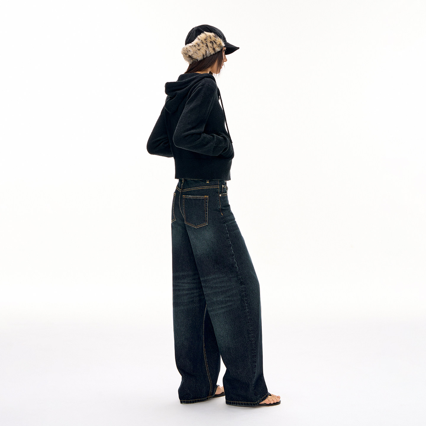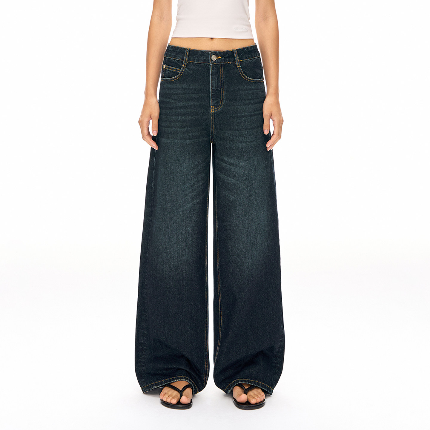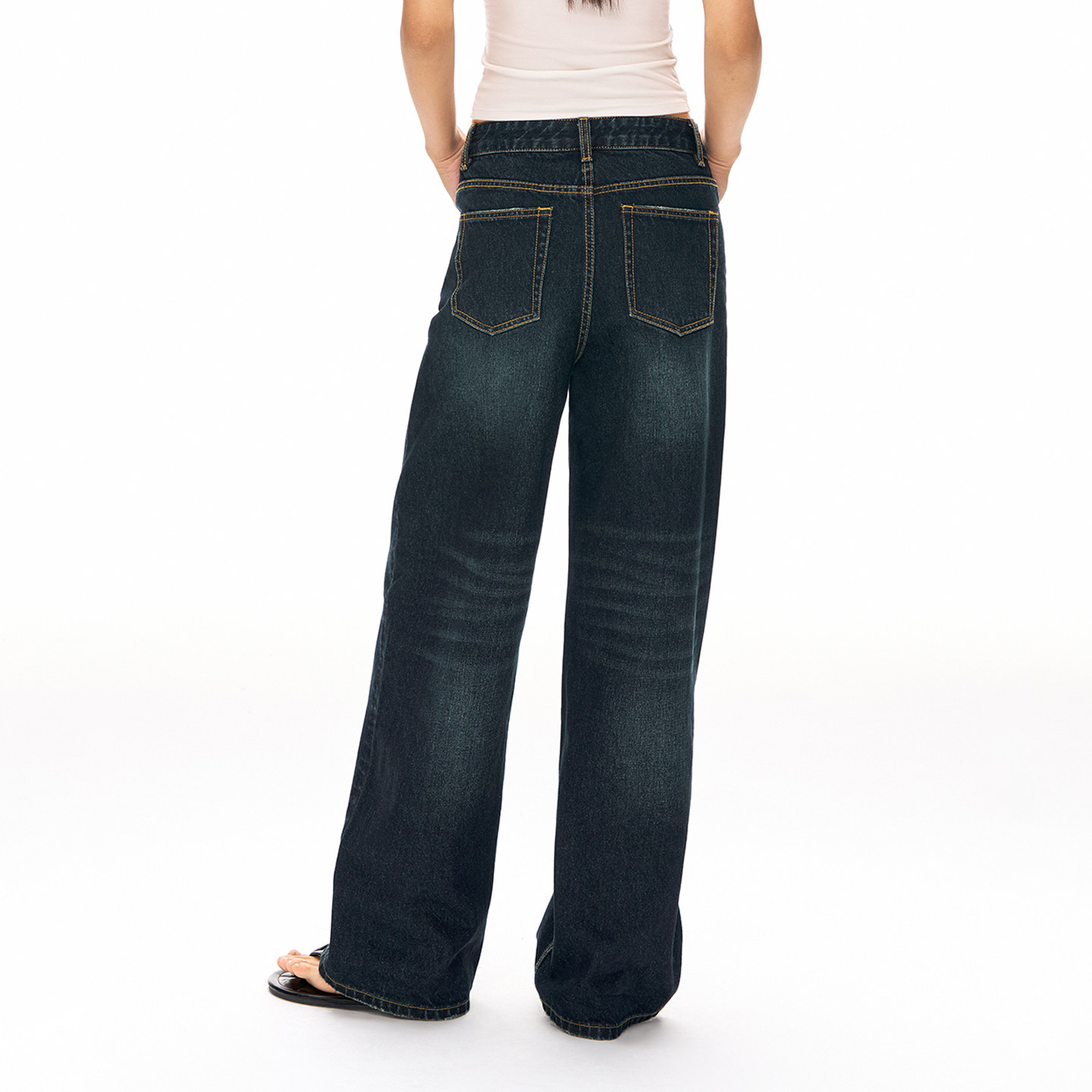 CLIMAX VISION复古做旧墨蓝水洗猫须直筒牛仔裤女款宽松阔腿长裤