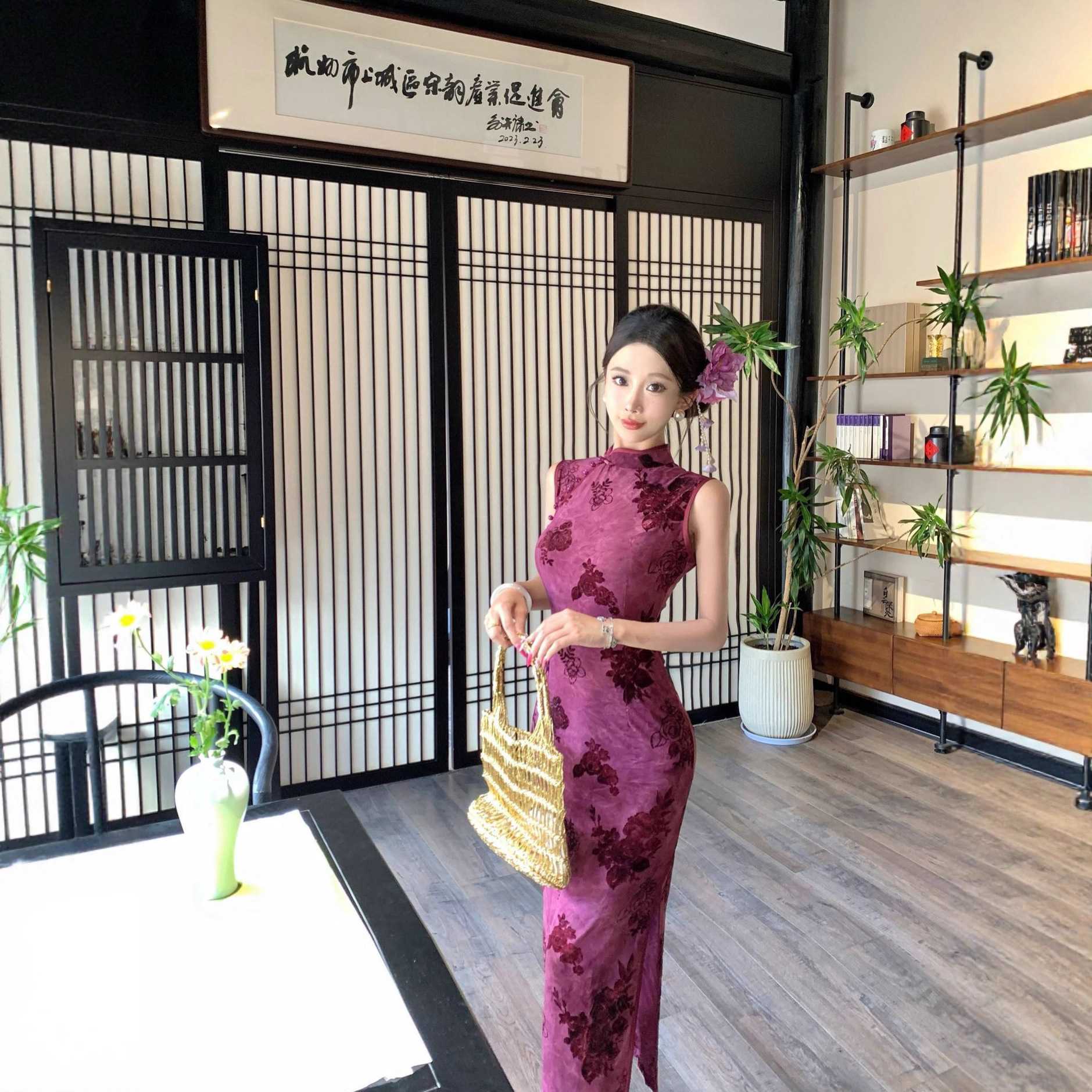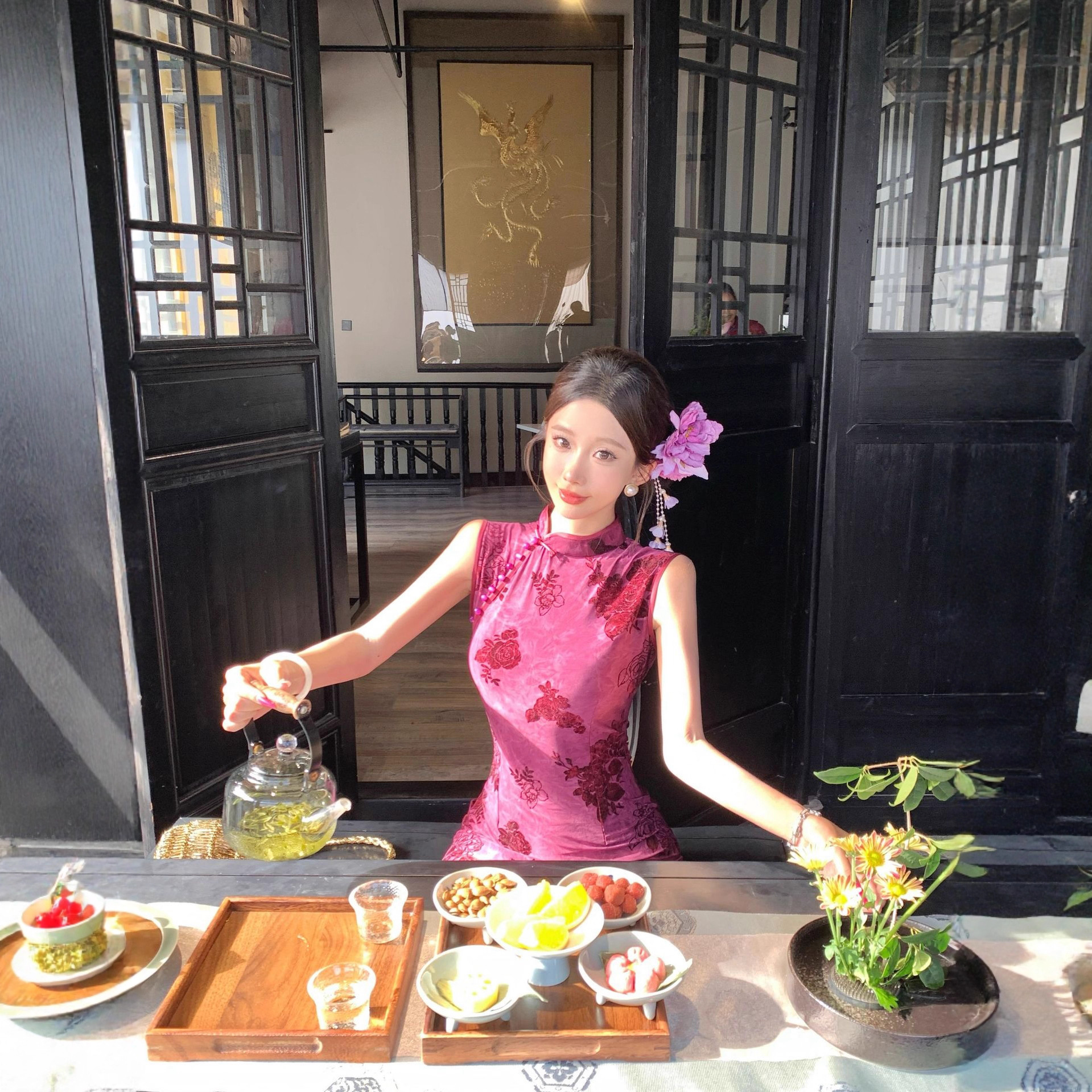 2025年紫色植绒民国风新中式国风弹力修身显白长款日常旗袍文艺