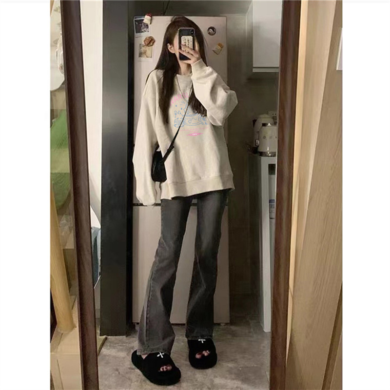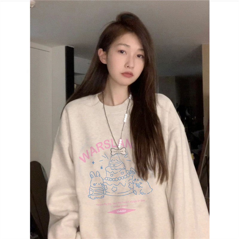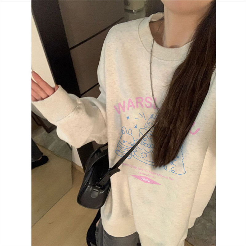 纯棉美式复古可爱兔子印花圆领卫衣女秋冬加绒加厚设计感长袖上衣