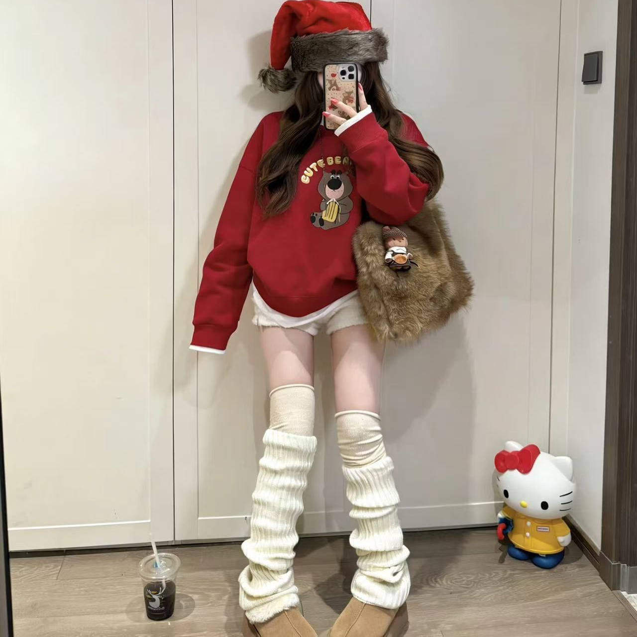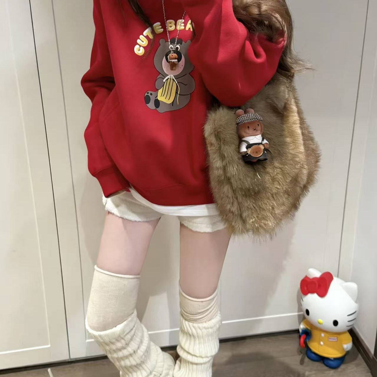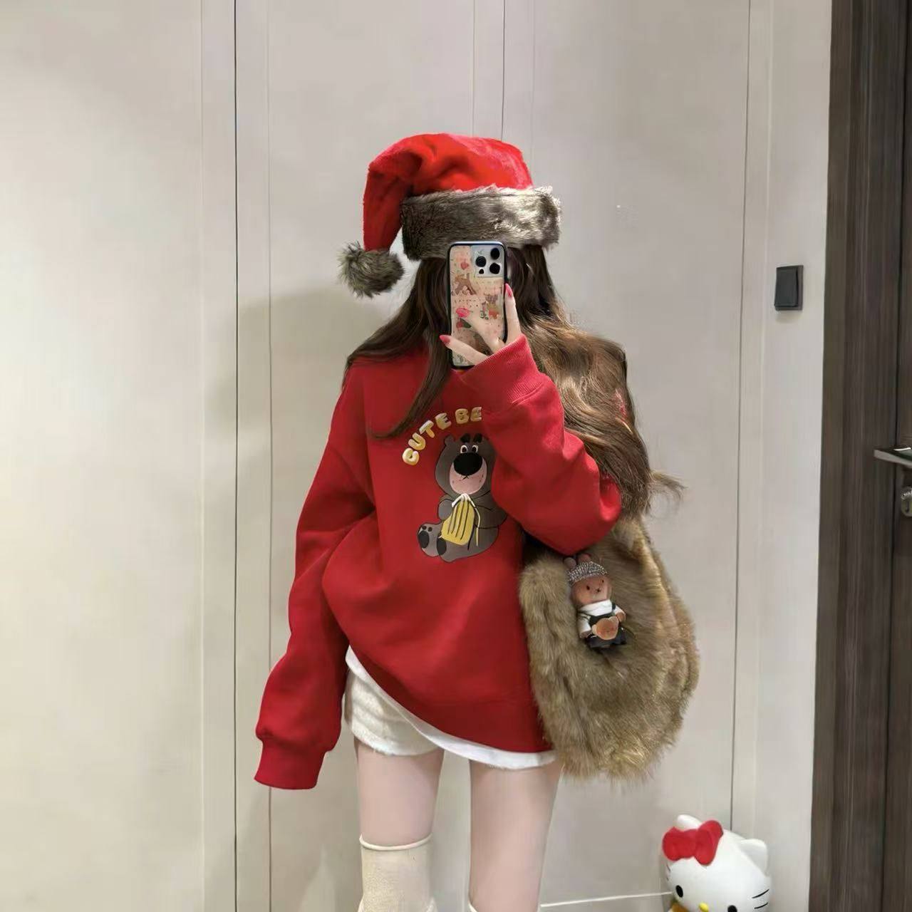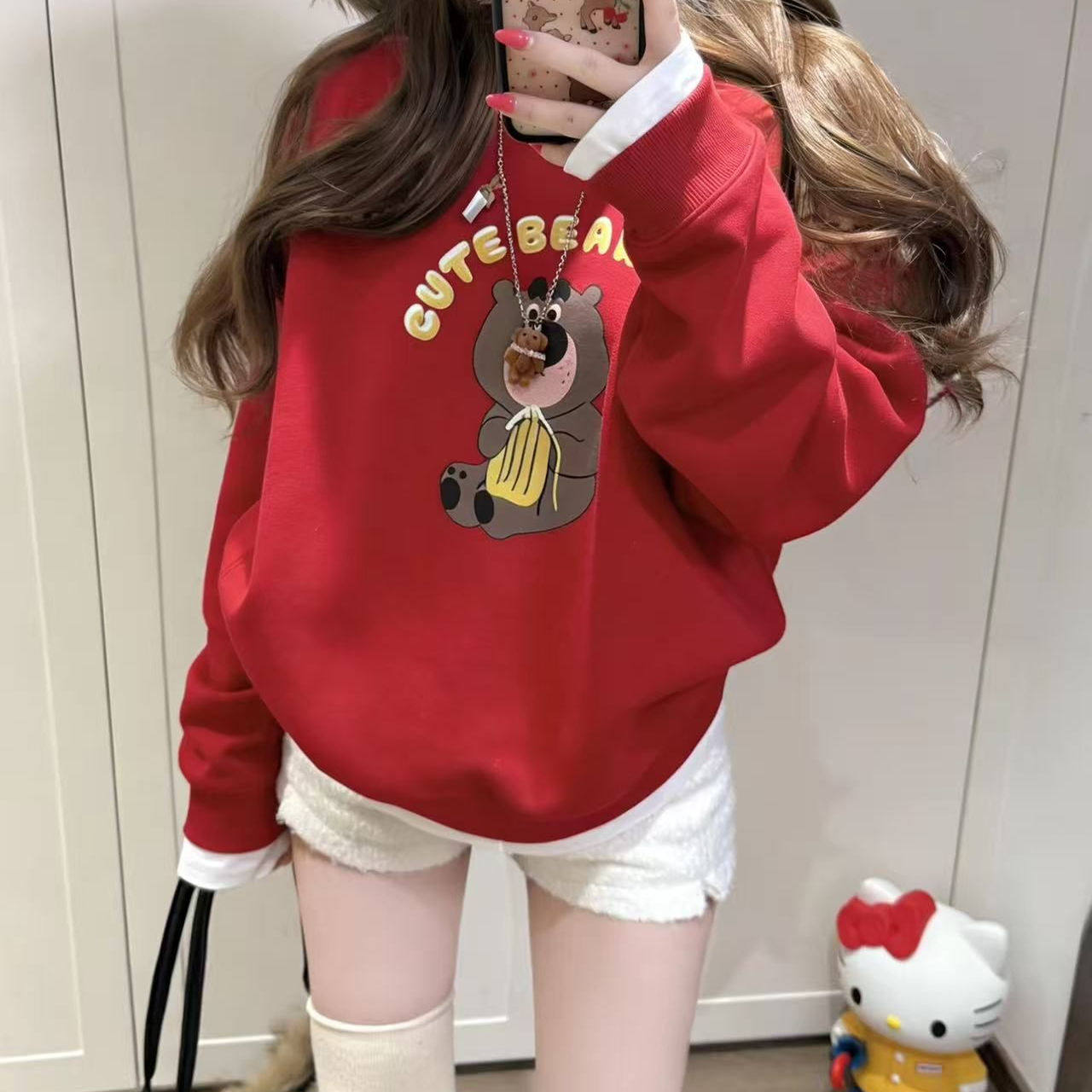 红色新年战服女大童纯棉圆领卫衣宽松初中高中学生秋冬长袖上衣女