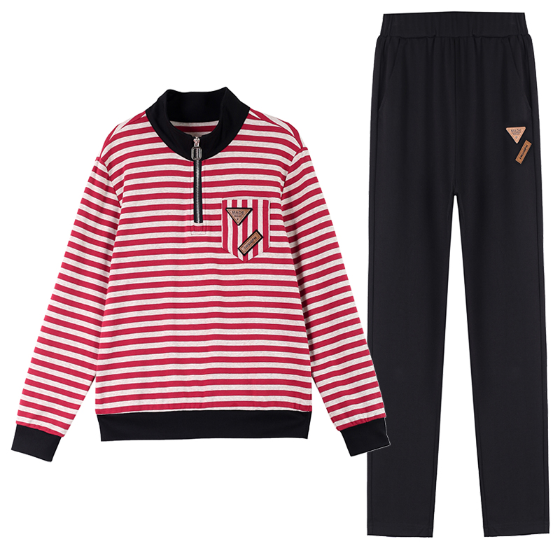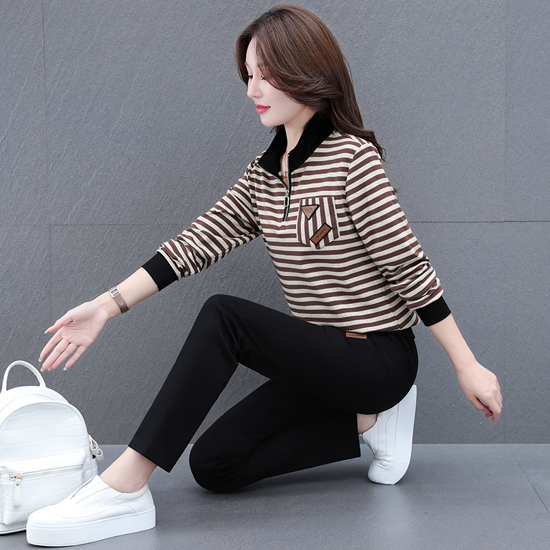 条纹减龄显瘦休闲运动服套装妈妈新款气质大码时尚洋气秋装两件套