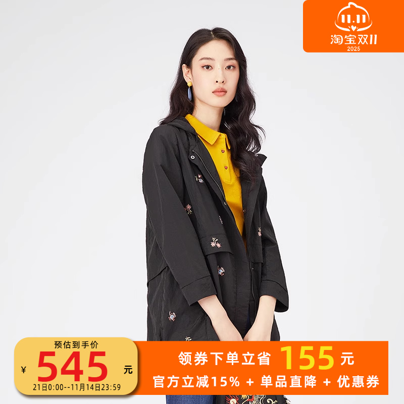 渔牌女装外套女款新款春夏连帽刺绣花中长款风衣外套FGGA3020