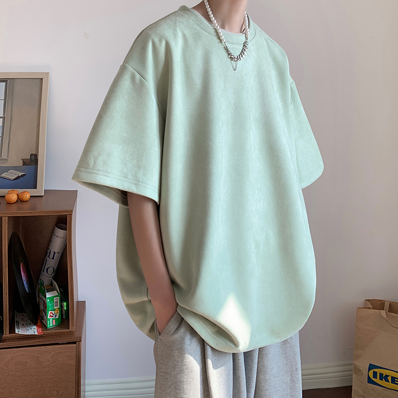 大码300斤美式复古麂皮绒短袖t恤男夏季潮牌宽松基础款五分袖体恤