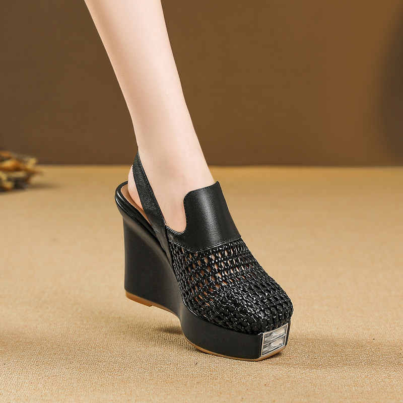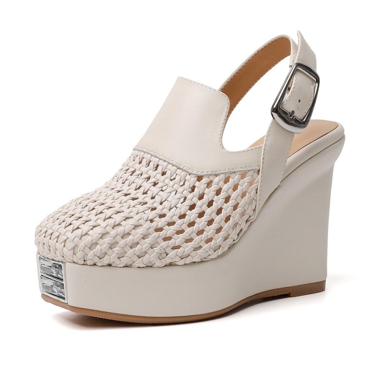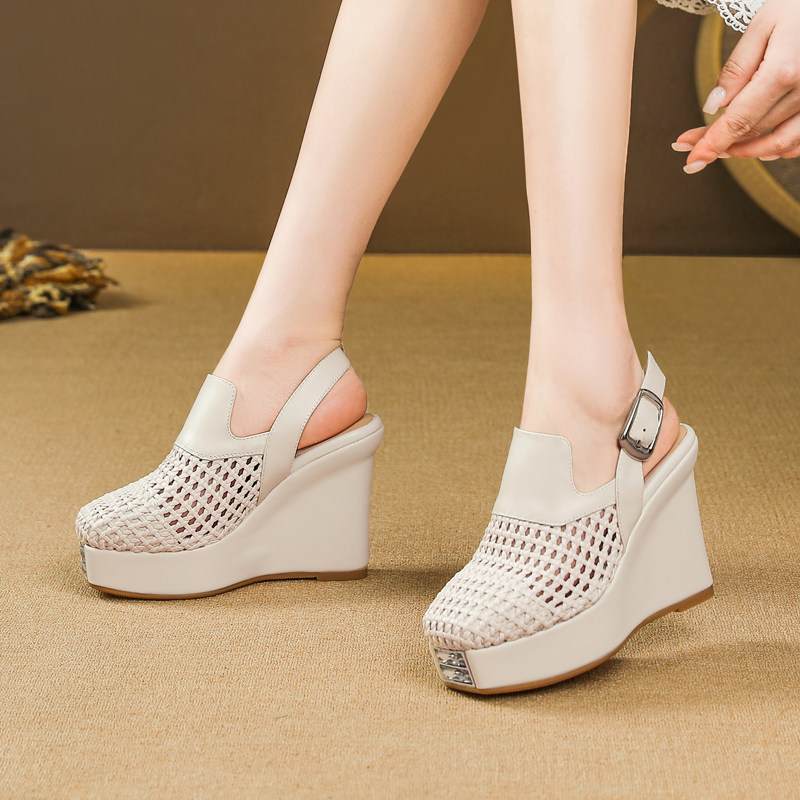 11cm包头凉鞋女夏季外穿真皮镂空编织女鞋增高小个子厚底粗跟凉拖