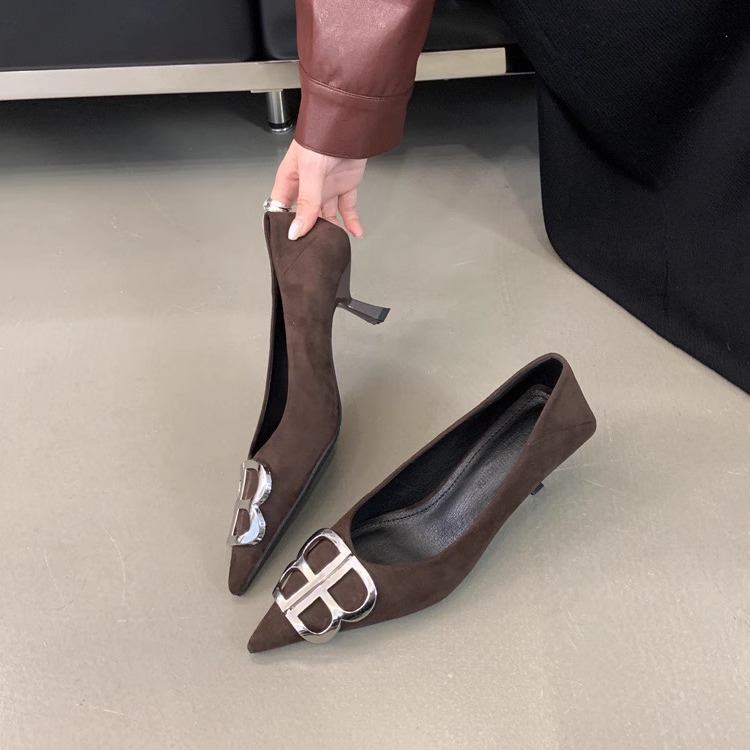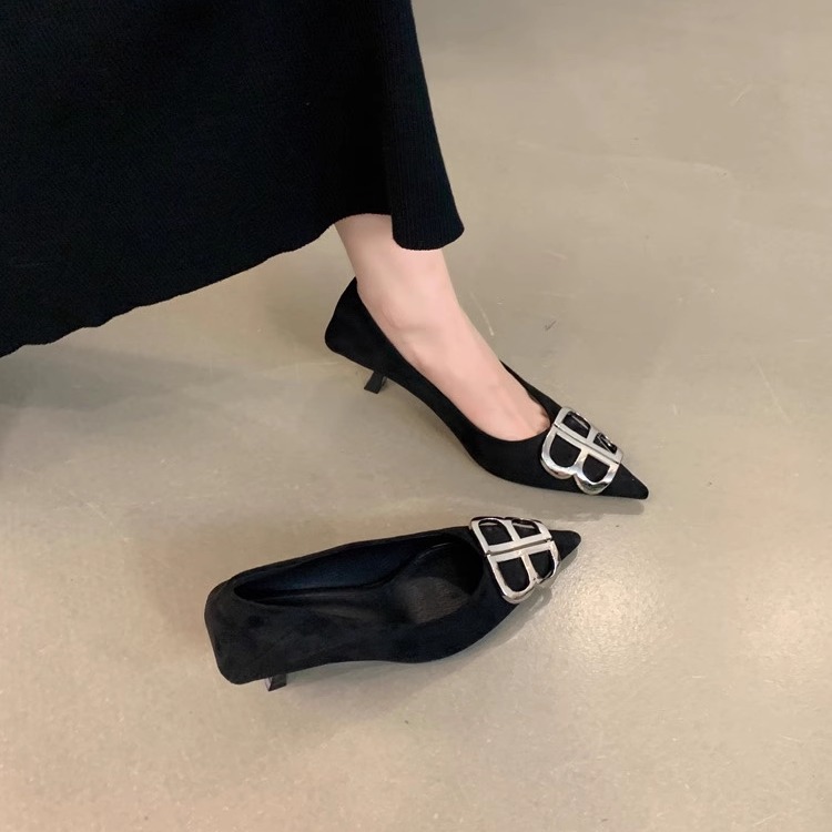 2025年新款法式浅口单鞋小众设计尖头bb扣气质绒面细跟高跟鞋女鞋