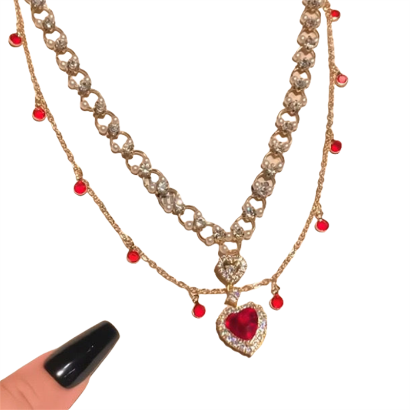 红色爱心珍珠双层叠戴项链轻奢小众高级感锁骨链2025新款爆款气质